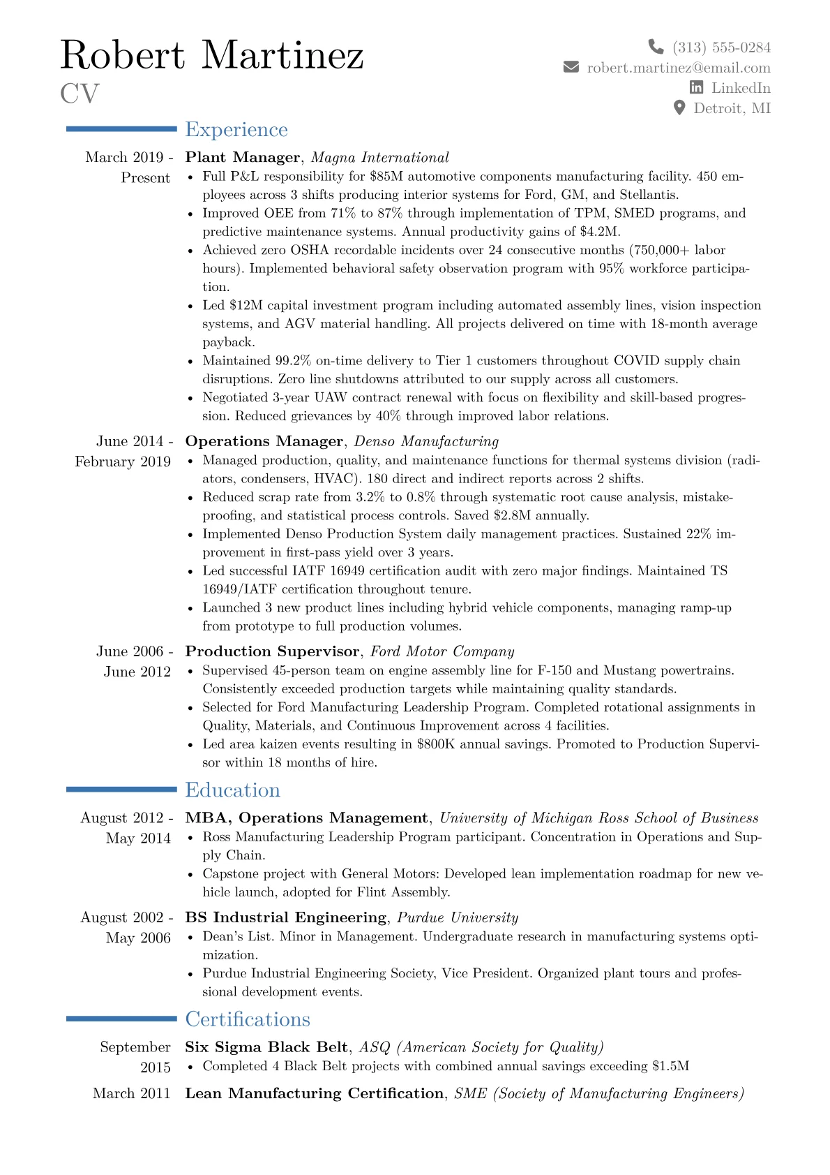 Every metric in this CV maps to something a board cares about: safety record, production efficiency, cost reduction, on-time delivery. "87 OEE" isn't just a number; it's industry benchmark territory. "Zero OSHA recordables" over two years is a genuine achievement.