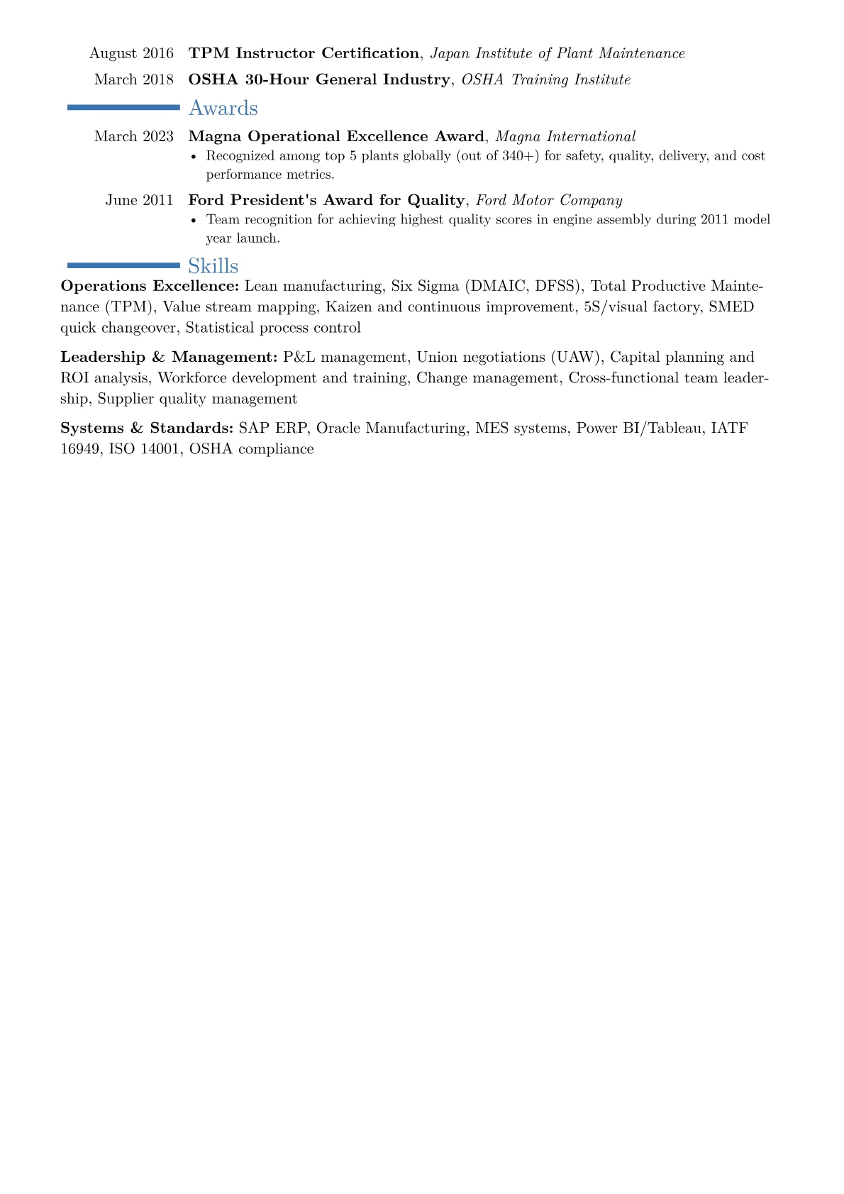 The Six Sigma Black Belt certification goes in a dedicated section because it signals methodology, not just results. Plant managers who can teach continuous improvement are more valuable than those who just know it.