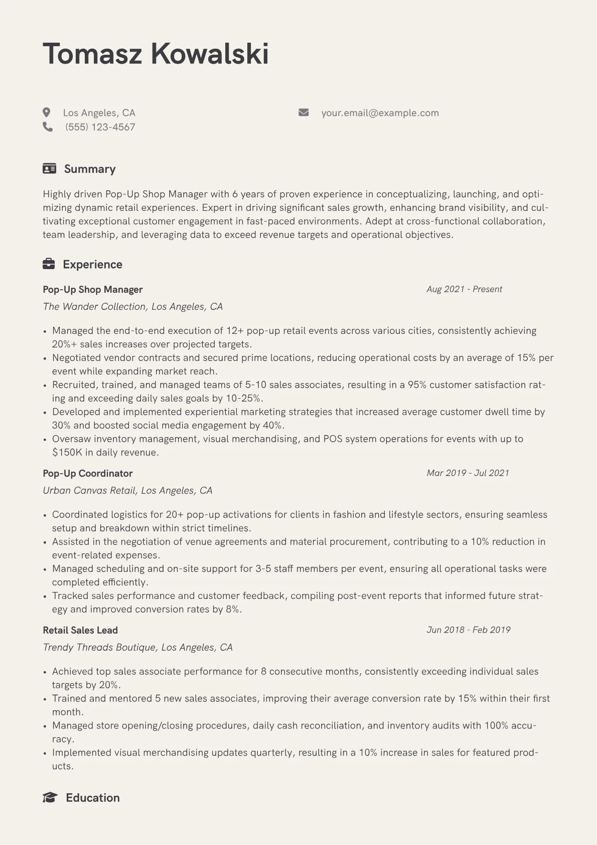 This template was built with JobSprout and can be remixed to create your own tailored Pop-Up Shop Manager resume.