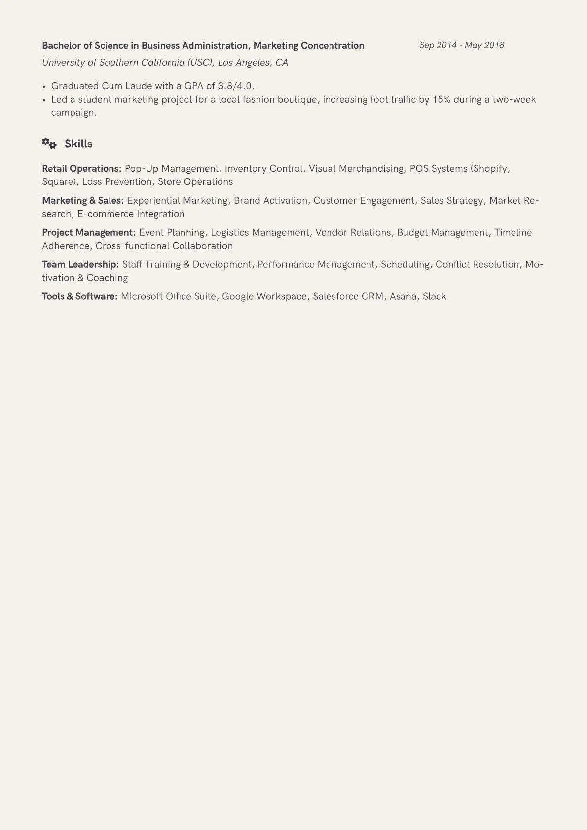 This example CV excels by clearly quantifying each achievement, transforming responsibilities into tangible results. For instance, bullet points detail specific revenue generated from activations or the number of successful events managed within a timeframe. Skills are intelligently grouped into categories like "Operations Management," "Sales & Marketing," and "Technology Proficiency," showcasing a balanced skillset essential for the role. Crucially, the resume highlights relevant tools and software, such as inventory management platforms and specific e-commerce POS systems, immediately signaling technical readiness to prospective employers.