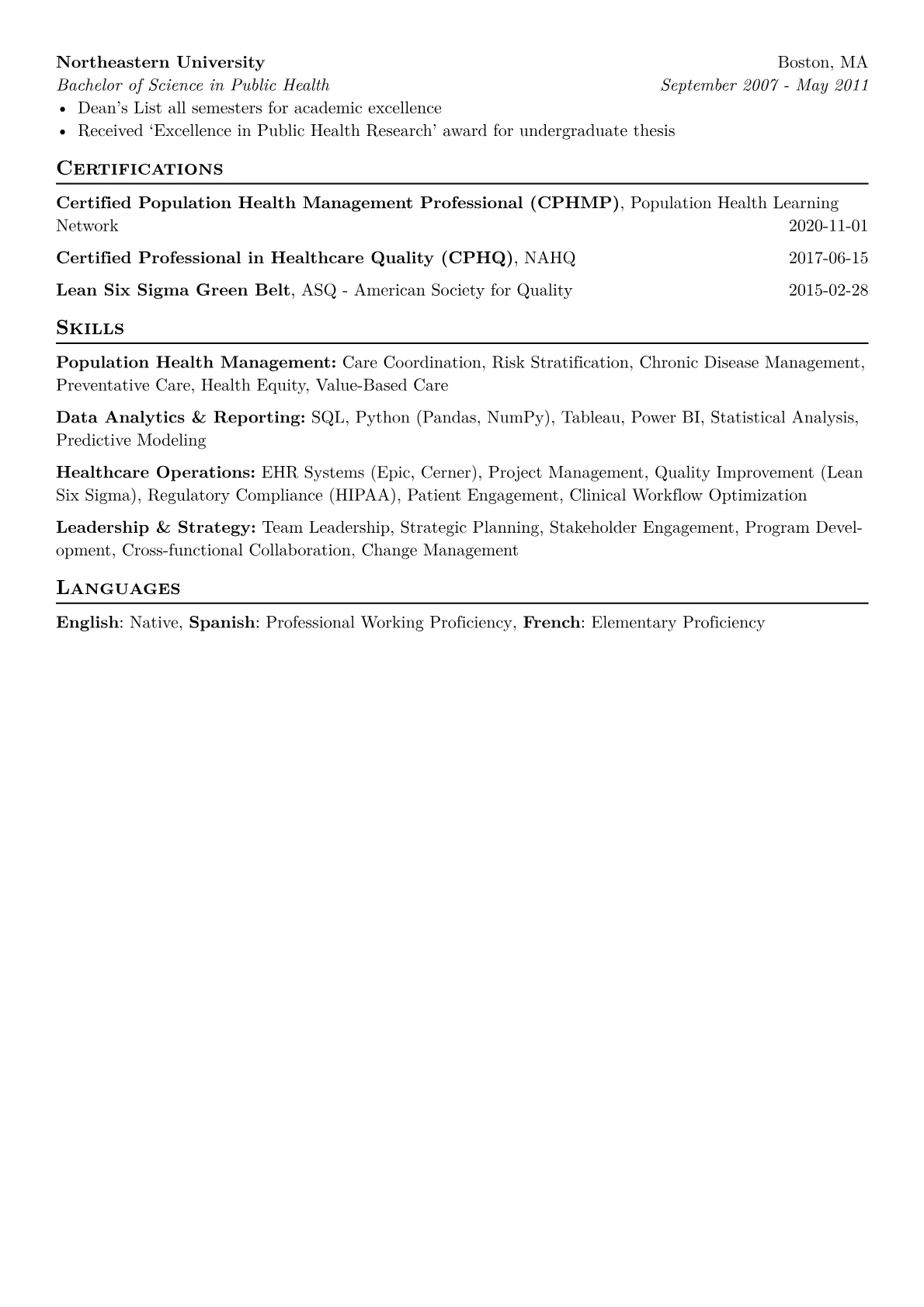 This example curriculum vitae effectively showcases these critical elements. Achievements are consistently quantified, such as "improved diabetes control rates by 12% across a panel of 5,000 patients," demonstrating direct influence. Skills are thoughtfully grouped into categories like 'Clinical Strategy and Analytics' and 'Care Coordination Leadership,' emphasizing both technical proficiency and leadership capabilities. Key certifications like CPHQ or Lean Six Sigma are prominently featured, alongside specific EHR and population health management software experience, affirming specialized expertise crucial for driving strategic initiatives.