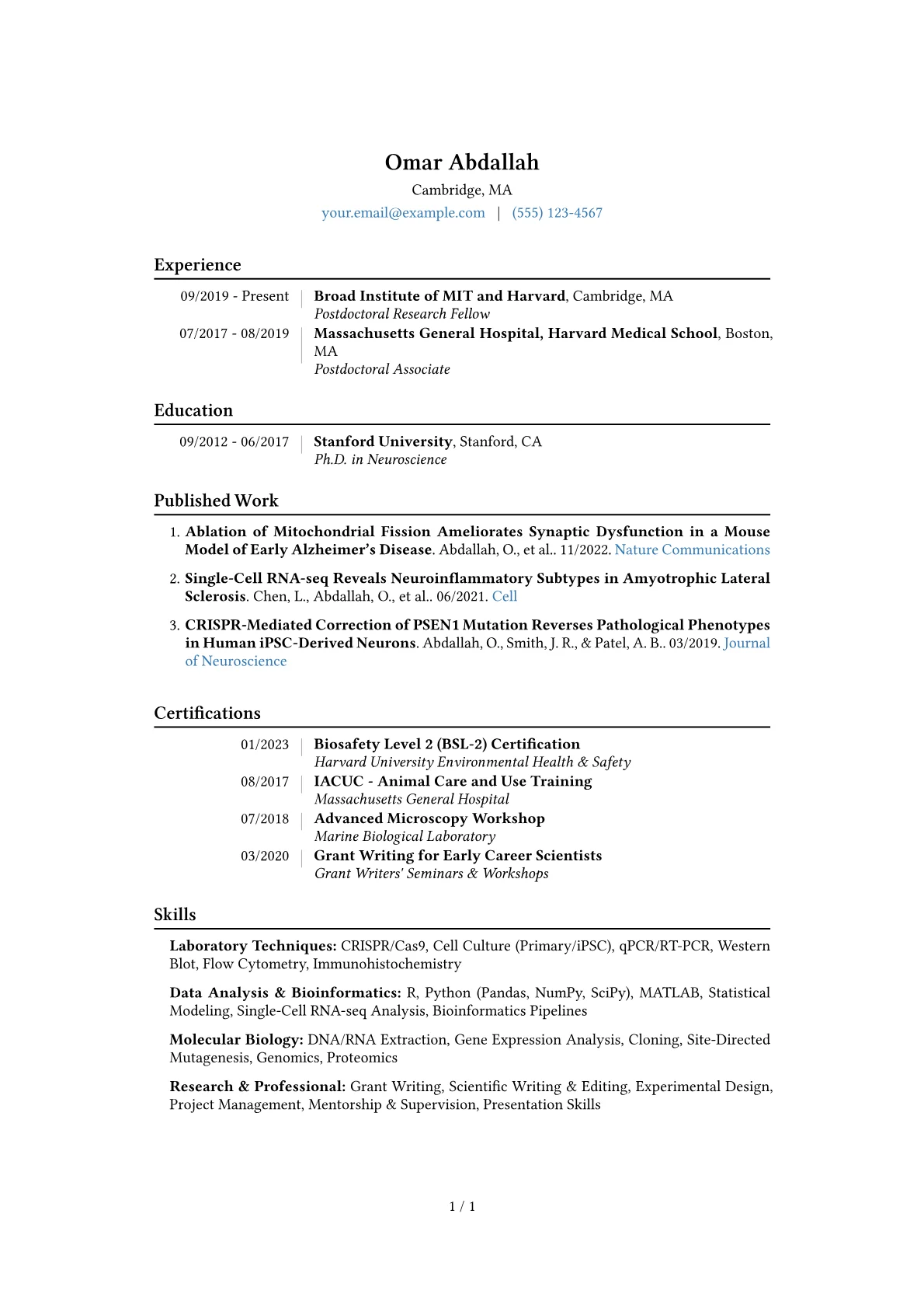 Crafting an impactful Postdoctoral Researcher resume requires highlighting a strong research trajectory, specific methodological expertise, and a clear vision for future contributions. Academia hiring managers prioritize a robust publication record, successful grant applications, and demonstrated independence in project management, often looking for alignment with their department's ongoing research initiatives. The unique challenge lies in showcasing advanced specialization while still conveying leadership potential and collaborative aptitude.