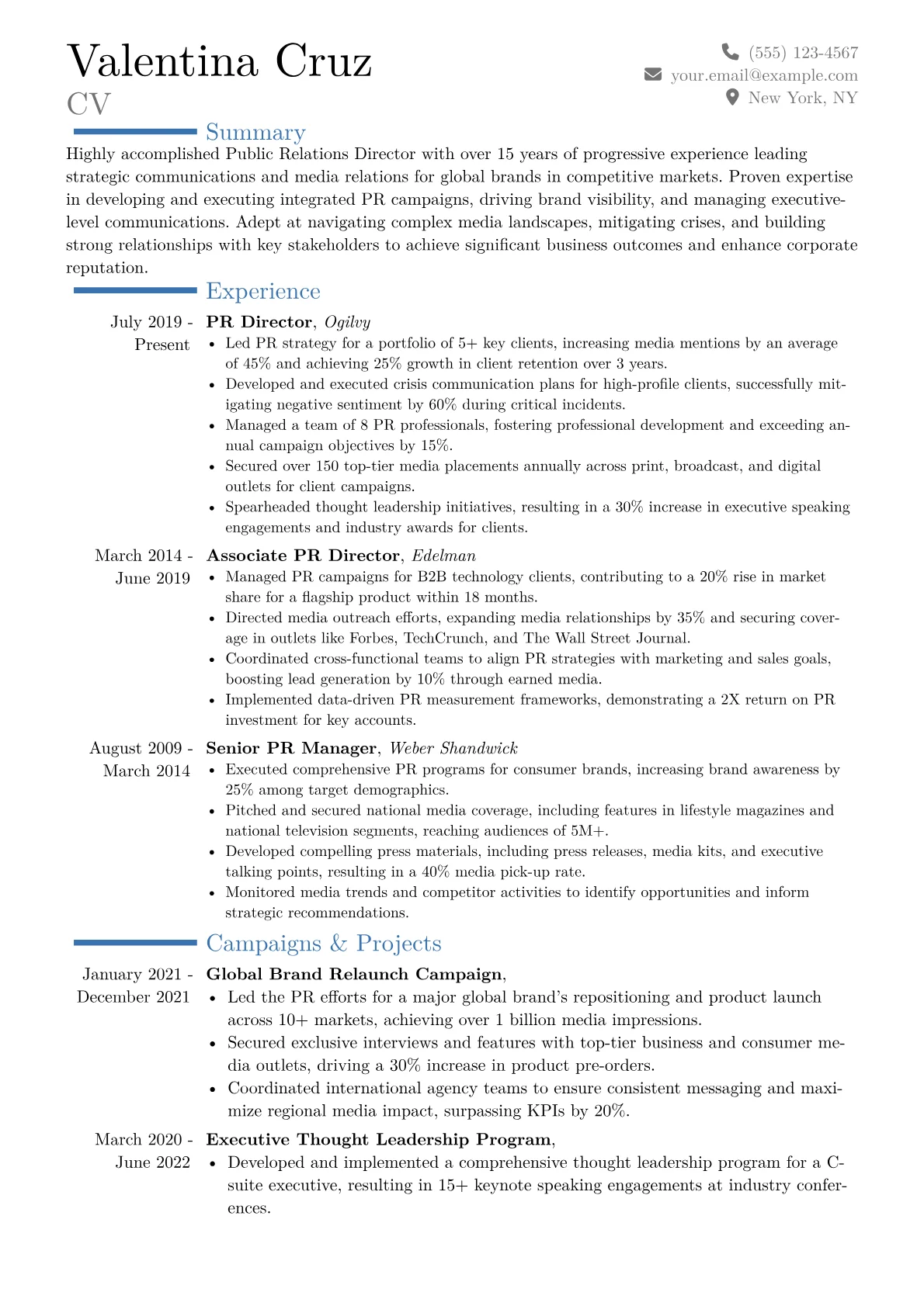 A compelling PR Director resume in Marketing and Advertising showcases strategic leadership in brand narrative and media influence. Hiring managers seek clear evidence of driving earned media value, adept crisis communication, and fostering robust agency relationships across diverse markets. Key achievements include successfully launching major campaigns, navigating complex reputational challenges, and securing top-tier media placements like Forbes or The Wall Street Journal. Experience with integrated marketing communications, thought leadership initiatives, and certifications such as APR (Accredited in Public Relations) are highly regarded, demonstrating industry expertise.