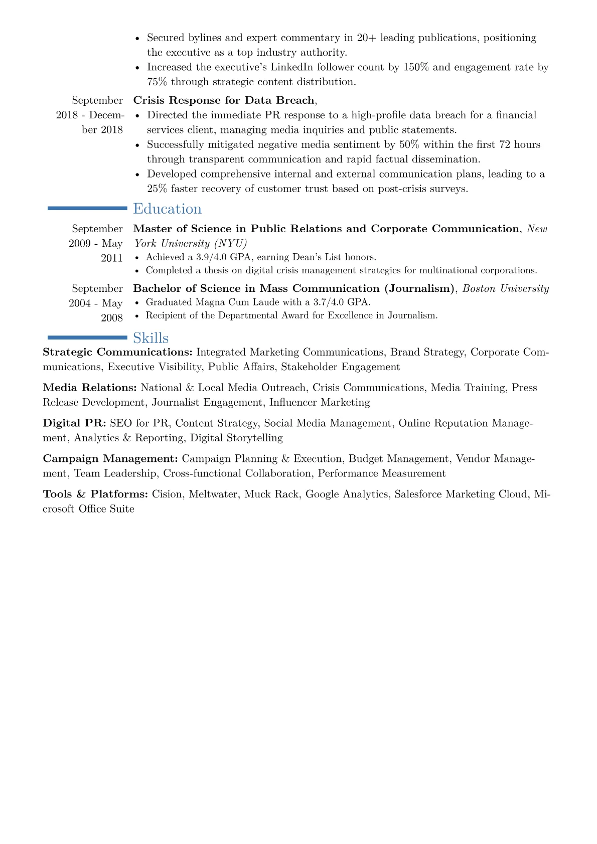 This example resume effectively highlights these critical elements through specific structural choices. Achievements are clearly quantified, such as increasing media mentions by a specific percentage or generating substantial earned media value. Strategic skills are grouped logically, separating areas like media relations from crisis management and influencer marketing. Furthermore, relevant industry tools like Cision or Meltwater, alongside any professional certifications, are prominently featured, demonstrating a command of essential resources.