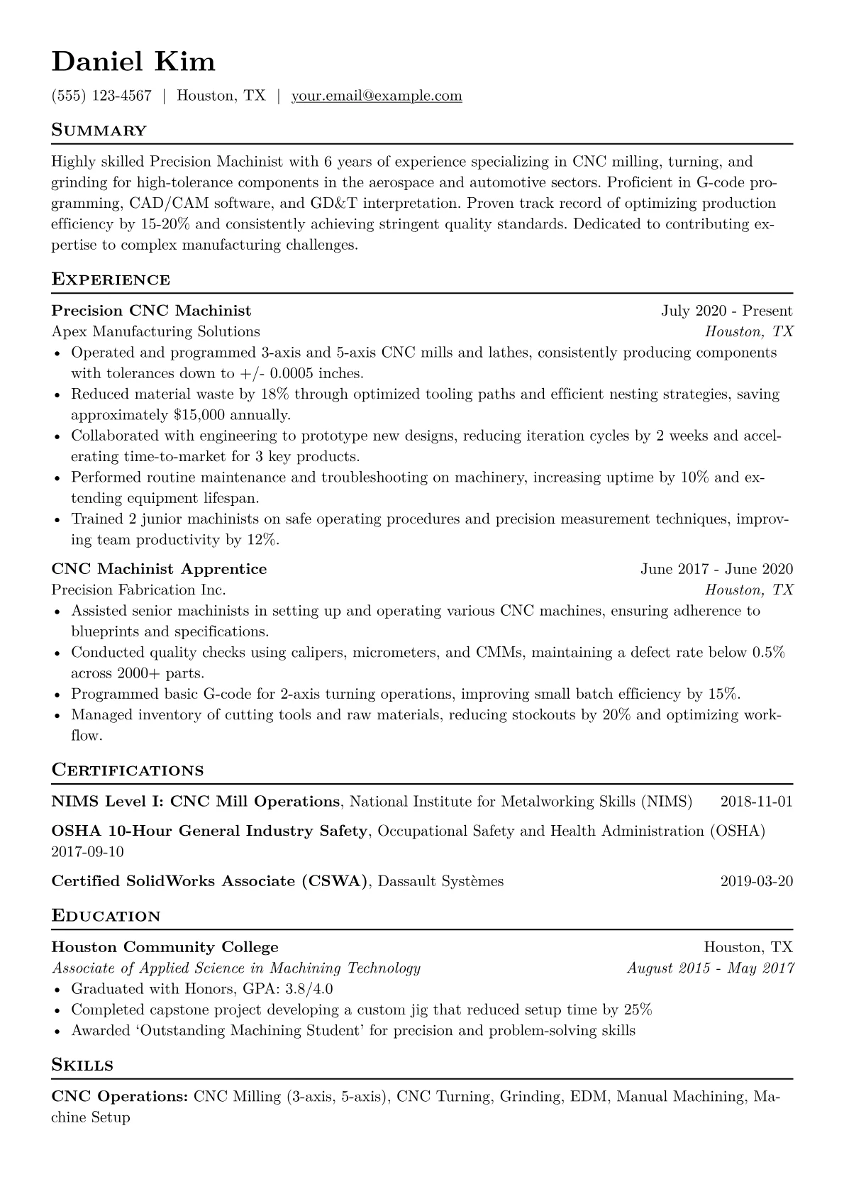 This example resume effectively showcases these vital attributes. It groups technical skills clearly, distinguishing between CNC programming capabilities (e.g., Fanuc, G-code) and inspection tools. Quantified achievements are paramount; for instance, detailing a "15% reduction in cycle time for custom component production" or "maintaining +/- 0.0005 inch tolerances on critical aerospace parts." The layout prominently features specific certifications like NIMS and lists mastery of particular materials or manufacturing processes, directly addressing industry demands for specialized expertise rather than generic statements.