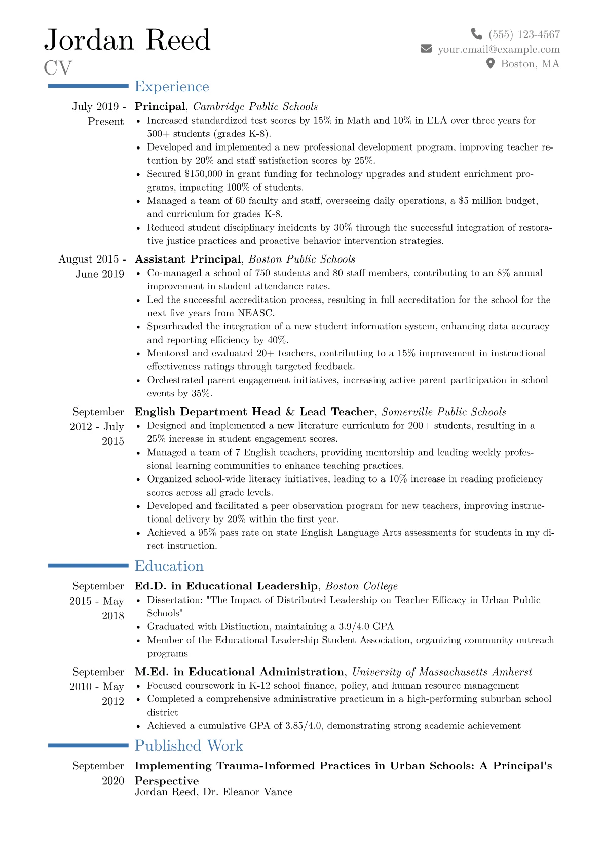 This impressive template was expertly crafted using JobSprout’s professional CV builder. Aspiring Principals can easily customize and remix this example to create a compelling resume that truly reflects their unique qualifications and career aspirations.