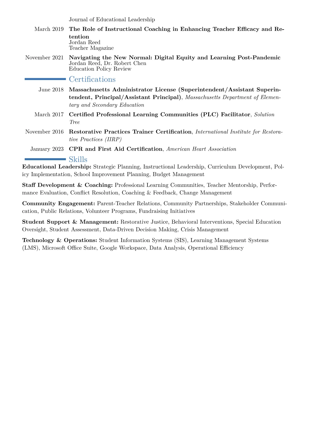 This Principal resume example particularly shines by presenting quantified achievements, detailing improvements in operational efficiency and student outcomes, such as reduced absenteeism or optimized resource allocation. Its strategic skills grouping effectively showcases core competencies like curriculum development, staff mentorship, and facility management, complemented by a clear presentation of relevant state certifications.