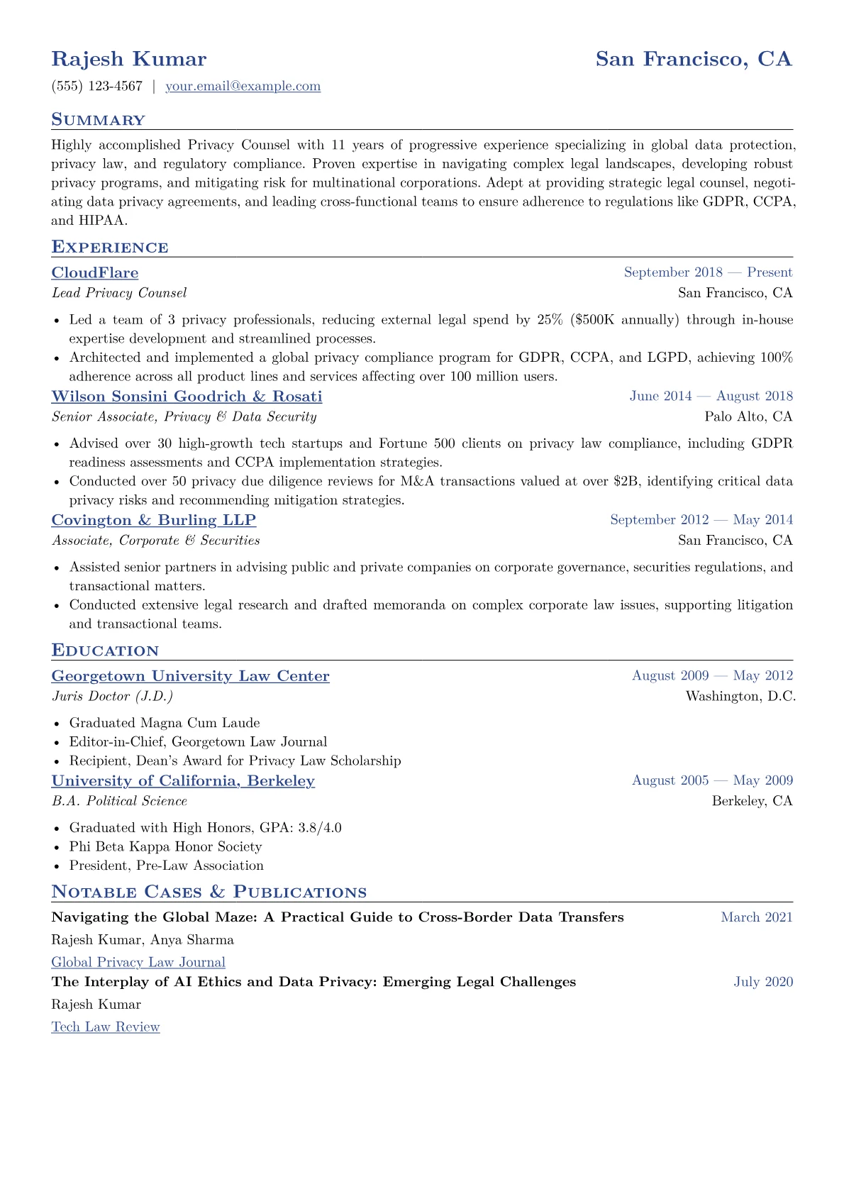 This template was built using JobSprout and provides a robust framework that can be easily remixed to create your own tailored Privacy Counsel resume.