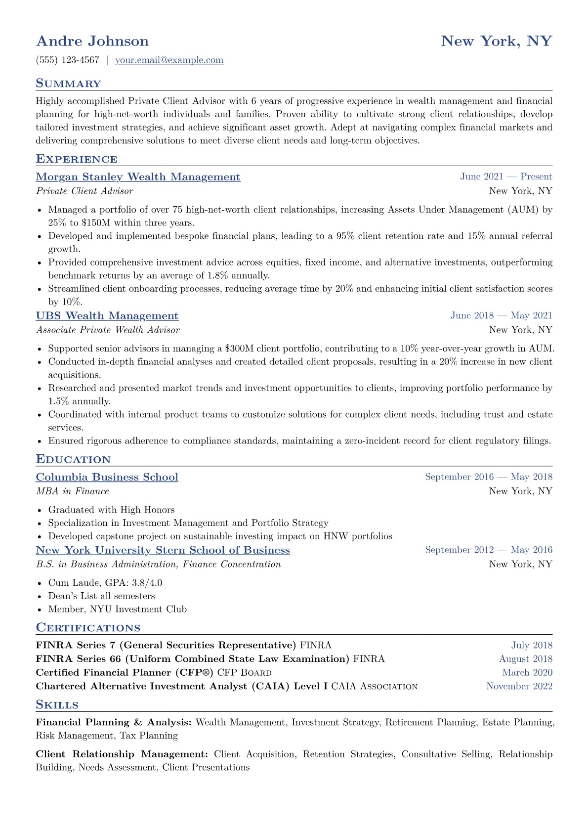 This template was built with JobSprout and can be remixed to create your own tailored Private Client Advisor resume. Leverage its expert design to articulate your unique value and land your next role.