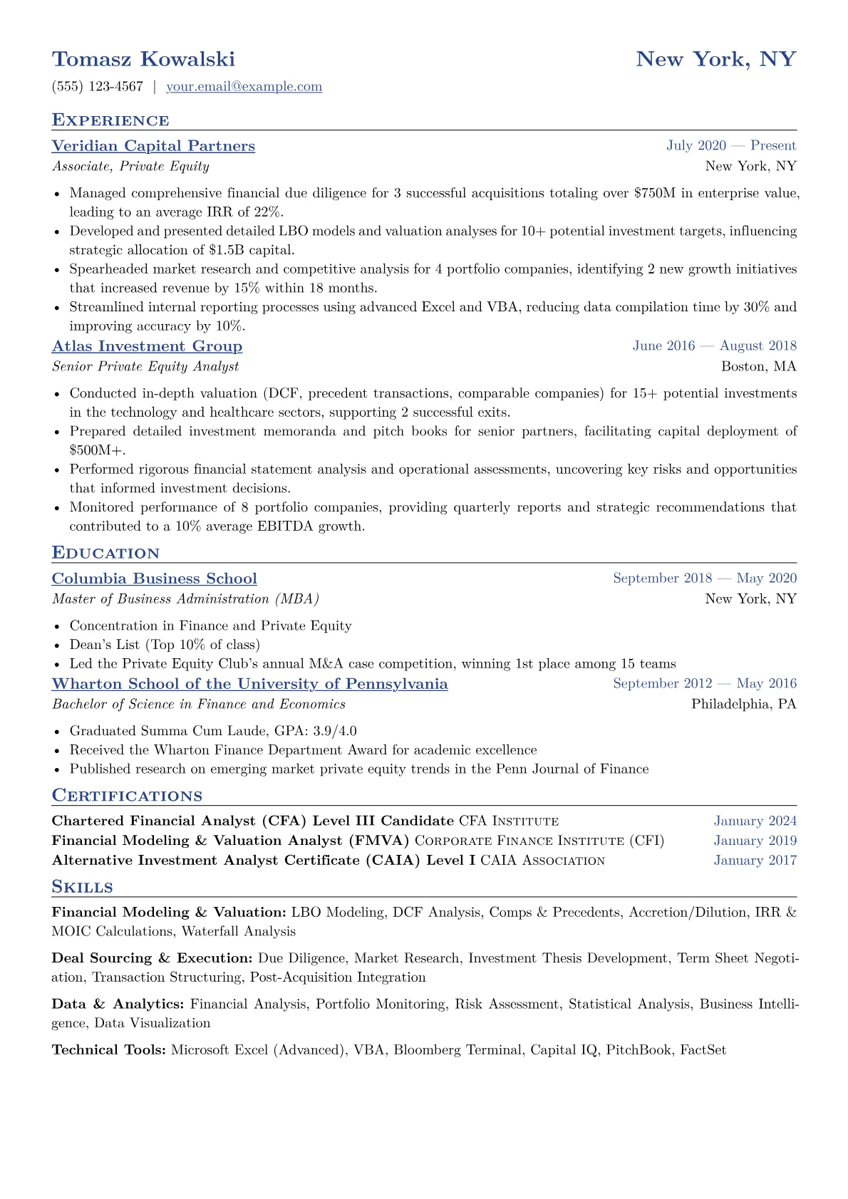 This JobSprout resume example excels by prominently featuring quantified achievements, detailing specific deal values, IRR contributions, and portfolio growth percentages, showcasing tangible impact. It strategically groups specialized skills like LBO modeling, valuation techniques, and due diligence under clear headings, allowing recruiters to quickly identify key competencies. Including relevant certifications further reinforces the candidate's professional commitment and expertise.