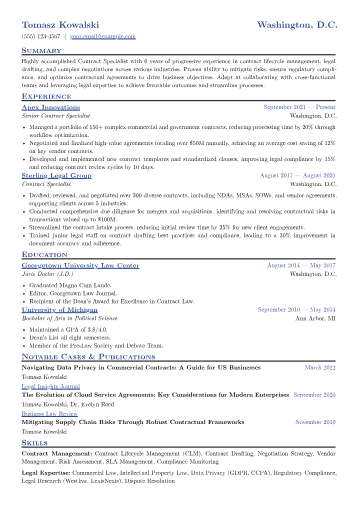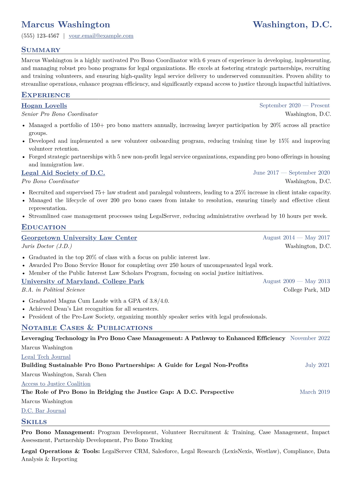 The JobSprout resume example excels by strategically quantifying achievements, providing concrete outcomes rather than general duties. For instance, bullet points detail metrics like "facilitated 200 annual pro bono placements" or "recruited 50 new volunteer attorneys," directly addressing scale and impact. Skills are grouped intelligently, separating "Program Management" from "Legal Technology," where specific tools like LegalServer and Salesforce are clearly listed. Any relevant certifications, such as a Paralegal Certificate or specialized non-profit management training, are also prominently highlighted, reinforcing specialized expertise for pro bono coordination.
