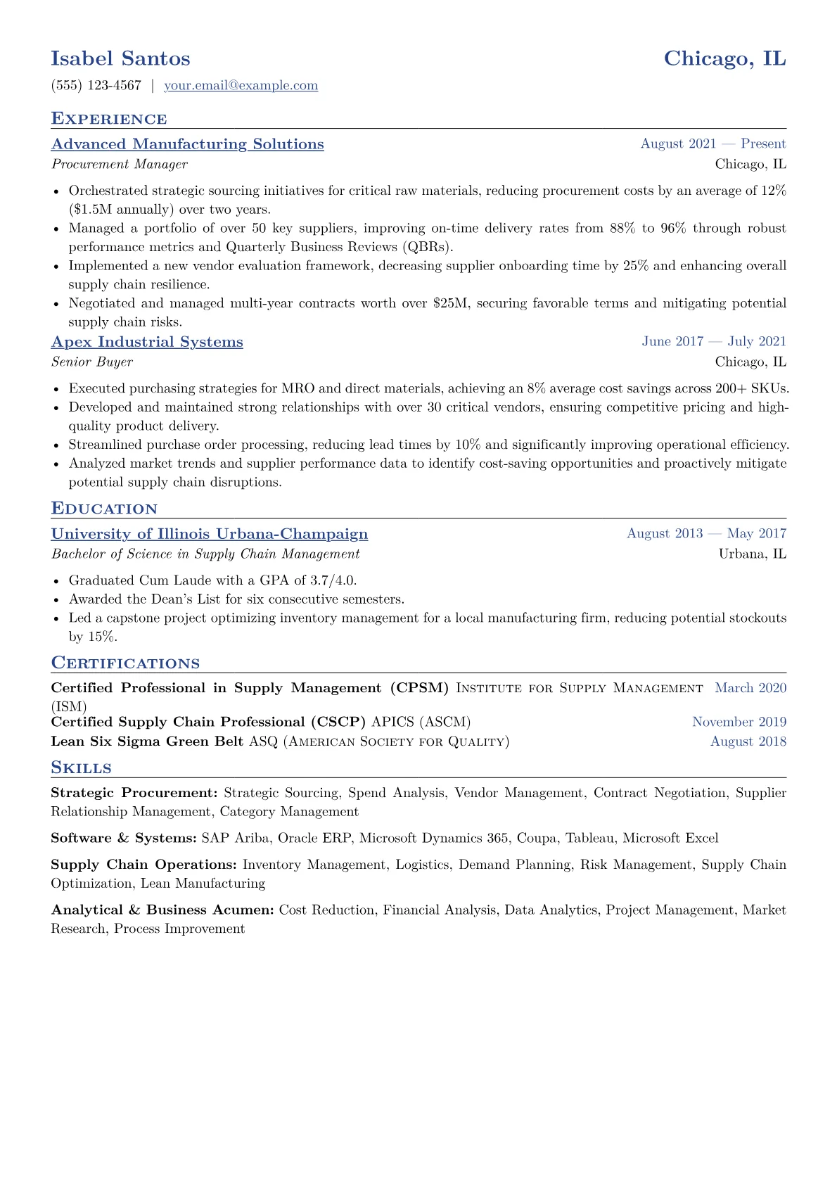 For a Procurement Manager in manufacturing operations, a standout resume clearly demonstrates quantifiable achievements in cost savings, supply chain optimization, and risk mitigation. Hiring managers prioritize candidates who can effectively navigate global supply chain complexities, secure critical components, and improve operational efficiency within production environments. The unique challenge lies in balancing cost pressures with ensuring uninterrupted material flow for manufacturing.