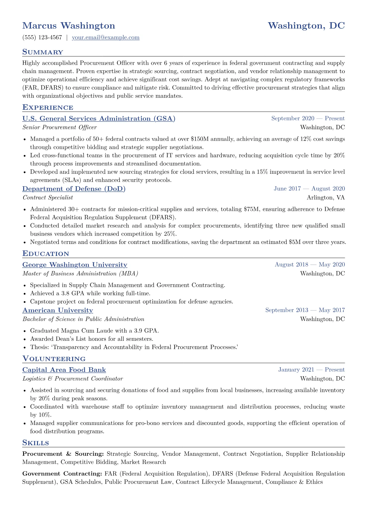 The JobSprout example page effectively showcases these critical elements. It quantifies achievements by stating concrete reductions in expenditure or improvements in contract efficiency, for instance, "negotiated 15 contracts resulting in 10% average cost reduction while maintaining quality." Skills are intelligently grouped, separating "Regulatory Compliance" (mentioning FAR, DFARS, state codes) from "Vendor Relationship Management" and "Contract Administration." Furthermore, it prominently features essential procurement software and relevant certifications in a dedicated section, immediately communicating specialized knowledge crucial for government roles.