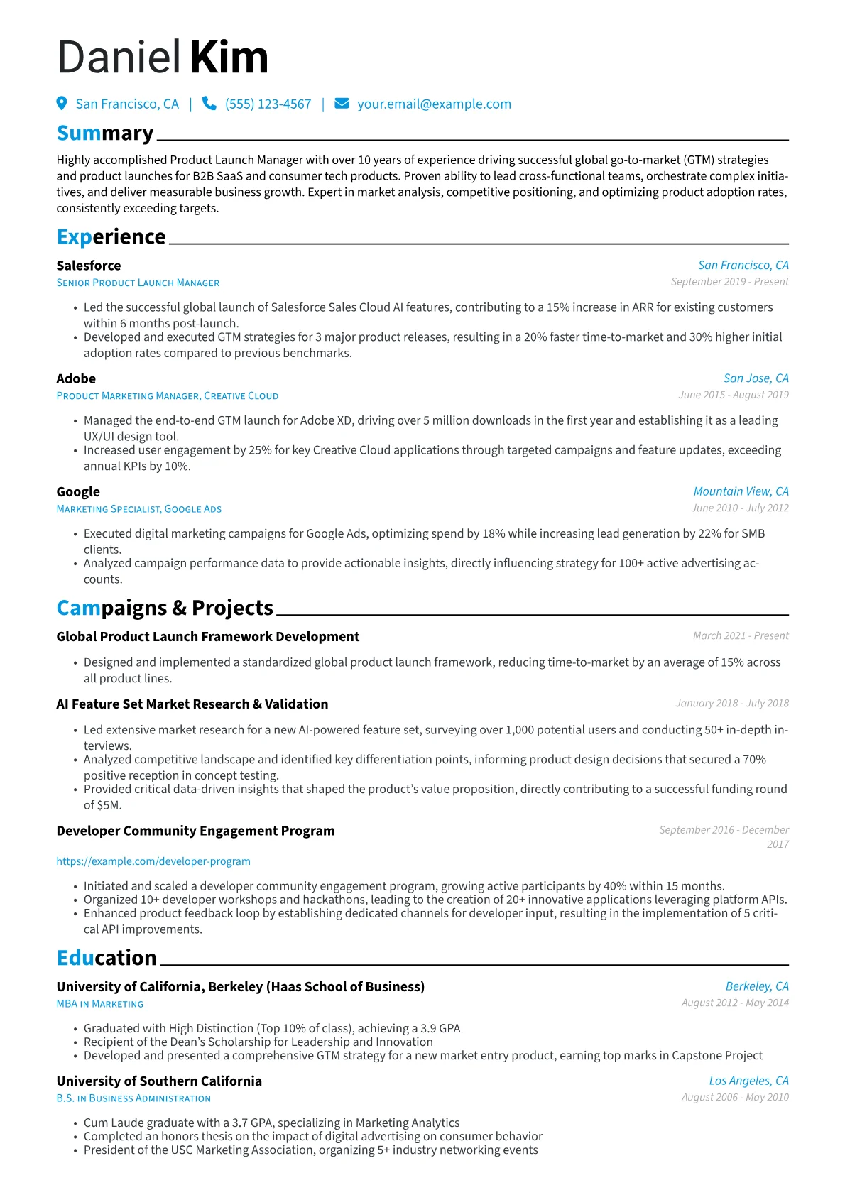 A compelling Product Launch Manager resume in Marketing & Advertising must showcase a clear ownership of the go-to-market strategy. Hiring managers seek candidates who demonstrate quantifiable impact on market penetration, revenue generation, and brand awareness. Beyond merely managing timelines, successful resumes detail achievements like securing media coverage, optimizing conversion funnels, or achieving specific market share percentages. Emphasize proficiency in market analysis, competitive positioning, and orchestrating comprehensive omnichannel campaigns. Certifications in digital marketing platforms or Pragmatic Institute frameworks add significant weight.