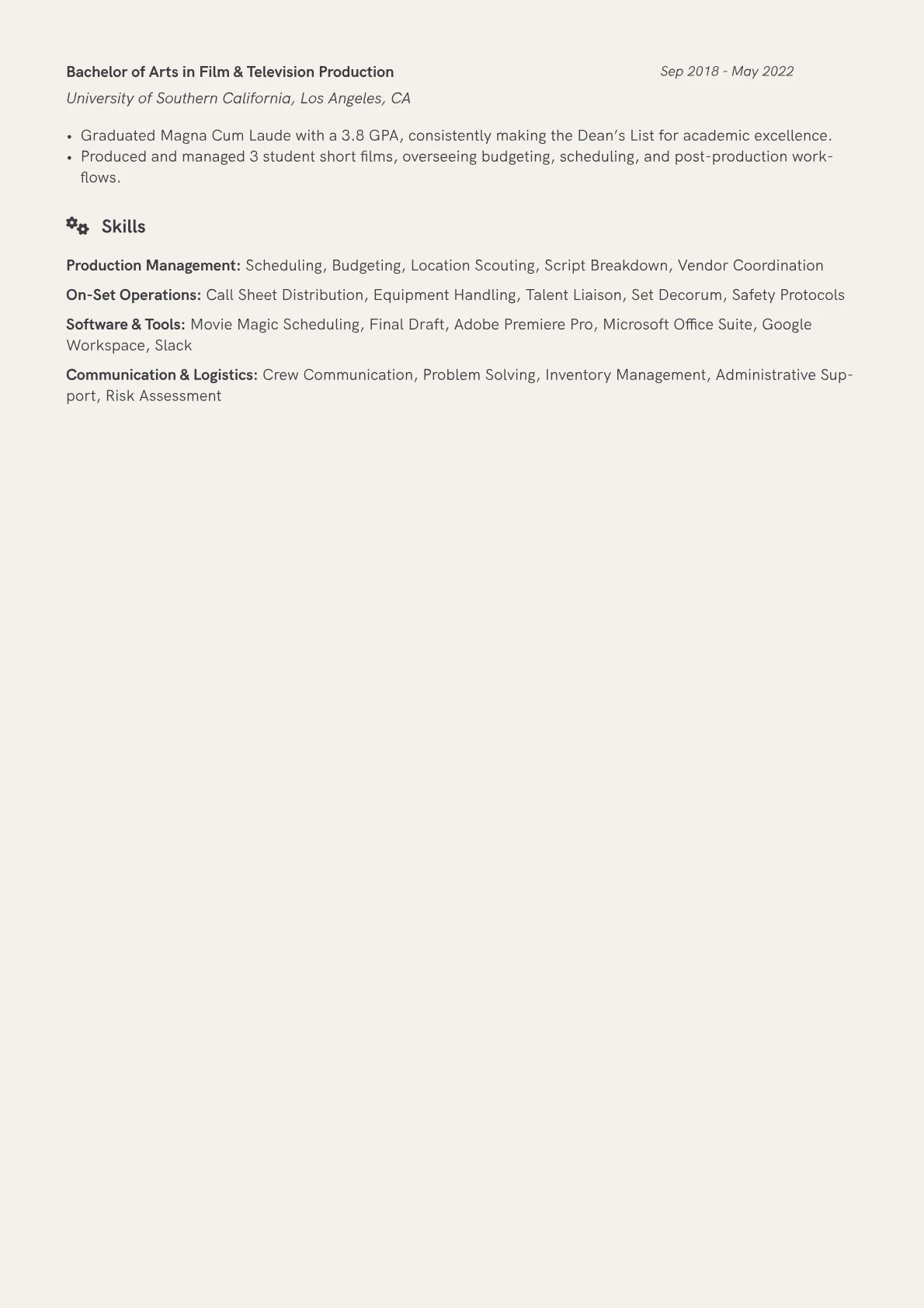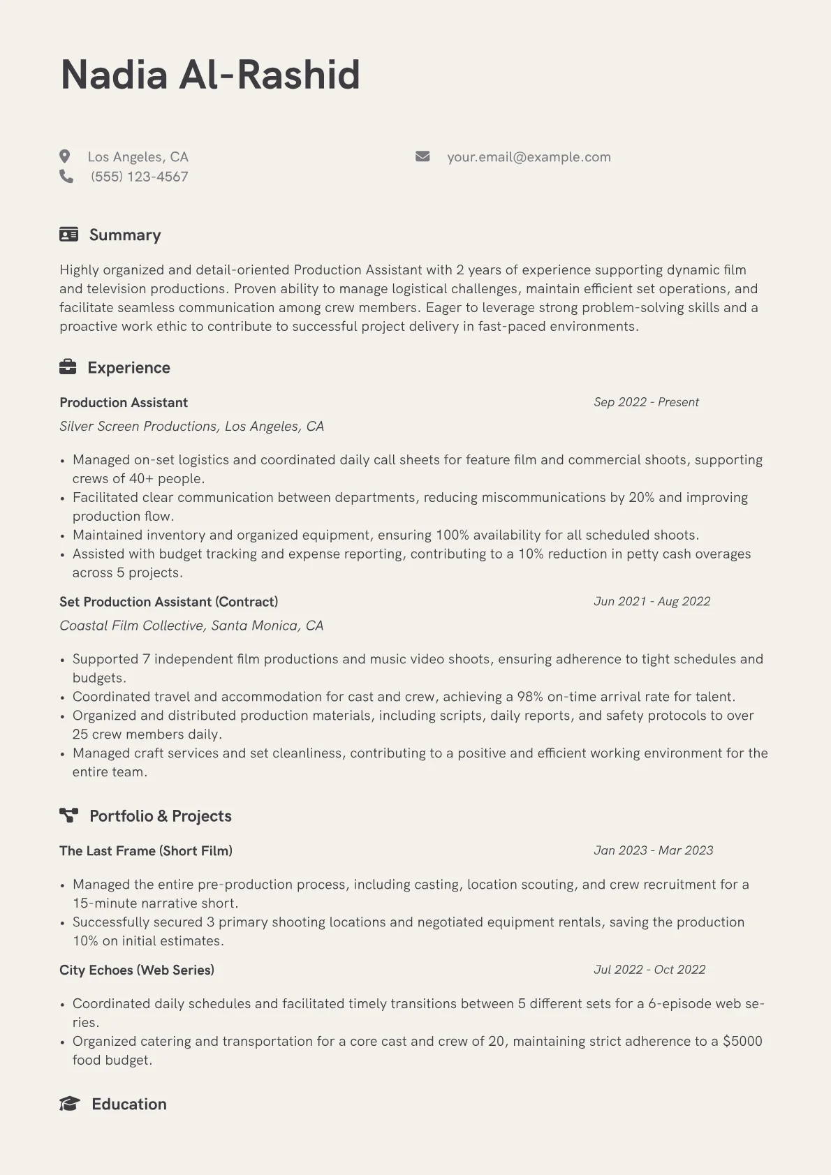 Reviewing an example resume for a Production Assistant in Film offers valuable insights into the Media & Entertainment industry. For entry-level roles, hiring managers seek candidates demonstrating reliability, resourcefulness, and a strong work ethic. Key achievements include managing logistical tasks, coordinating equipment setup, assisting with call sheet distribution, or ensuring timely set operations. Familiarity with production terminology, such as 1st AD, DP, or craft services, is crucial. A clean driving record, basic first aid, or knowledge of walkie talkie protocols are practical certifications that signify readiness for demanding on-set environments.