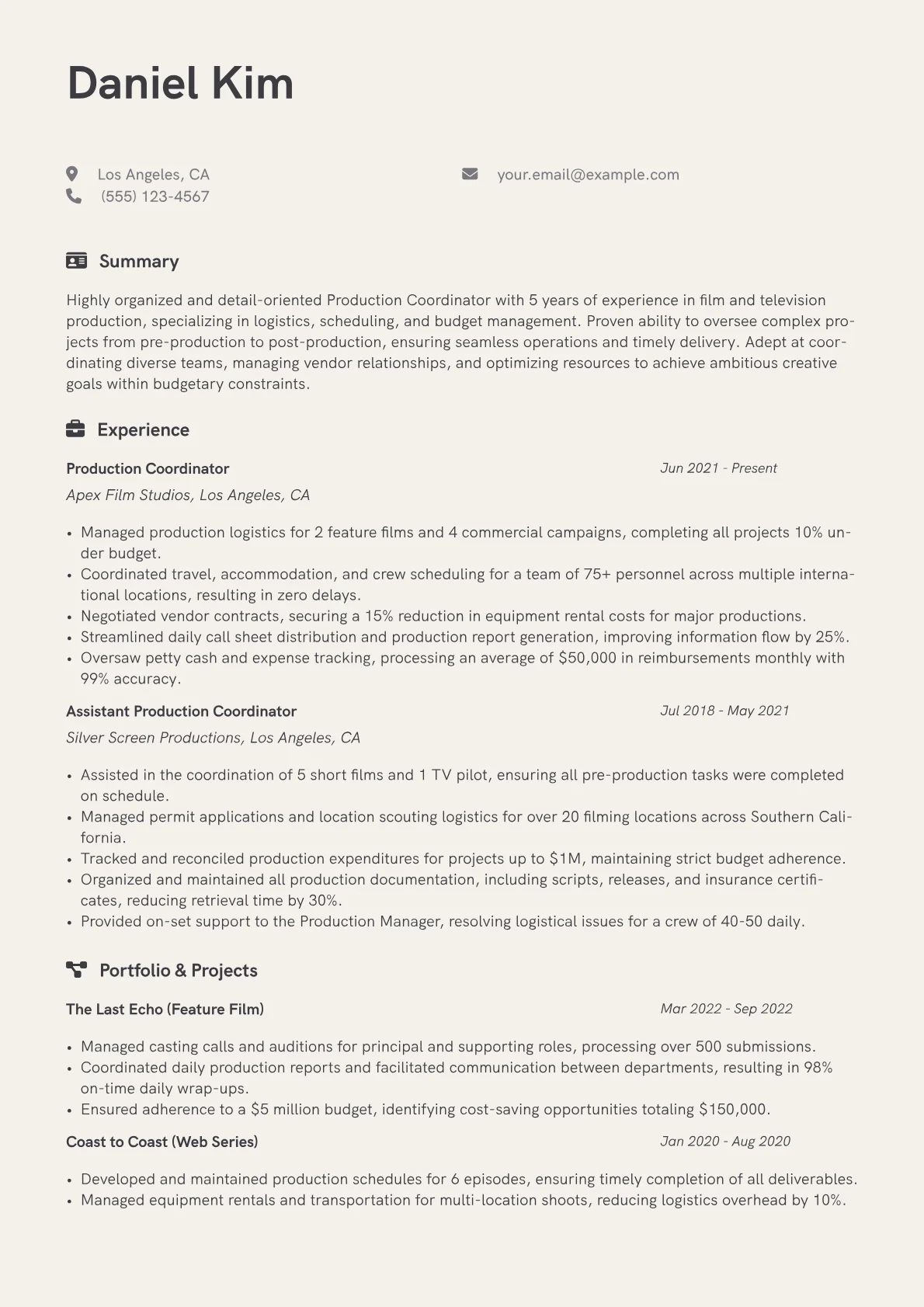 This template was built with JobSprout and can be remixed to create your own tailored Production Coordinator Film resume.