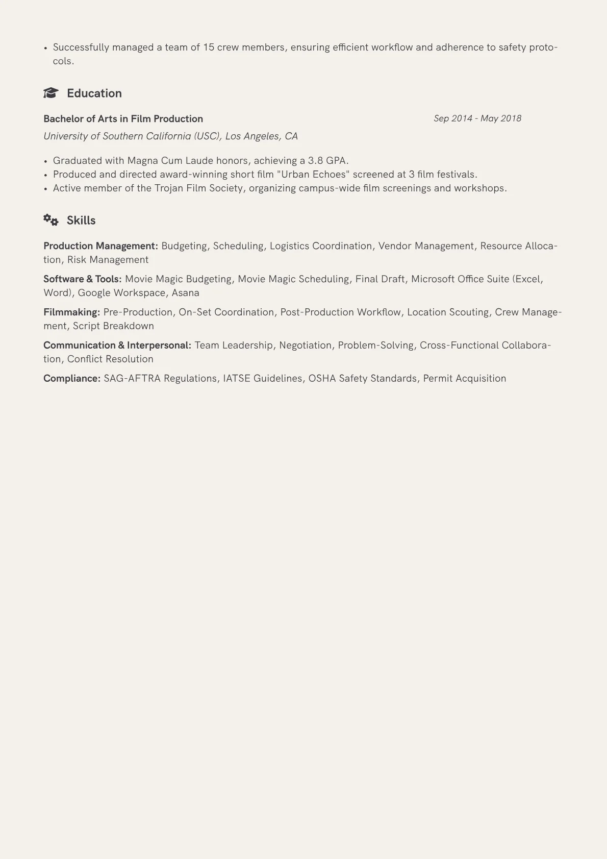 This JobSprout example effectively showcases these critical elements. Its structured format immediately draws attention to quantifiable accomplishments, such as coordinating crews of specific sizes or managing logistics for multi-location shoots. Technical proficiencies, including specialized film production software and relevant certifications like OSHA 10, are clearly grouped, distinguishing them from essential soft skills like communication and conflict resolution. The resume strategically highlights project-specific contributions, underscoring the candidate's direct impact on production efficiency and successful delivery.