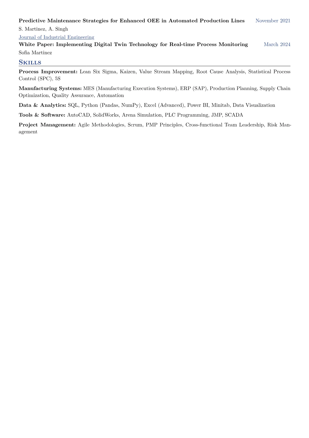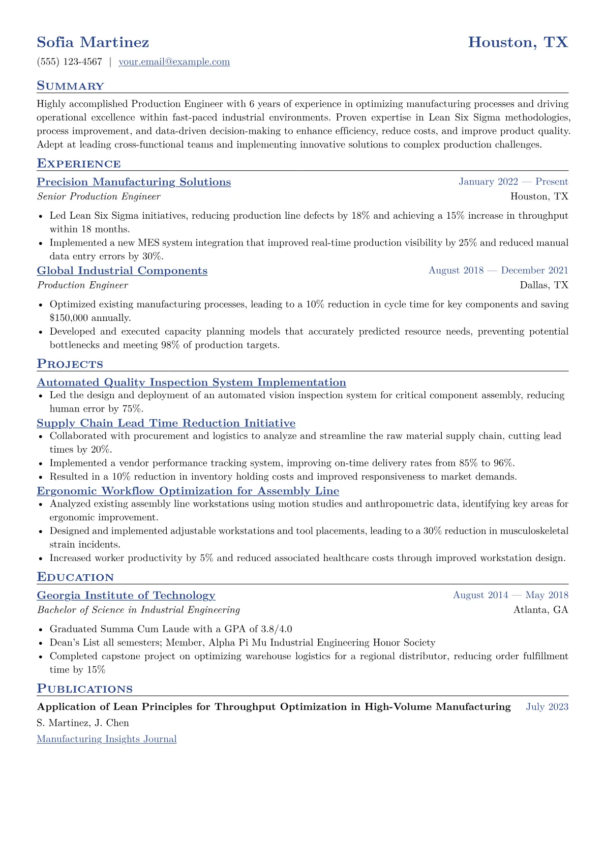 For a mid-level Production Engineer in manufacturing, a compelling resume articulates concrete impact on efficiency, cost, and quality. Hiring managers prioritize quantifiable achievements demonstrating process optimization, waste reduction, and improved throughput. Mentioning metrics like OEE, cycle time, or scrap rate is crucial. Experience with Lean Six Sigma methodologies, specific manufacturing software like MES or ERP, and hands-on familiarity with automation, PLCs, or CAD systems are highly valued. Certifications such as a Lean Six Sigma Green Belt or relevant safety training also add significant weight, showcasing a proactive approach to operational excellence and continuous improvement.