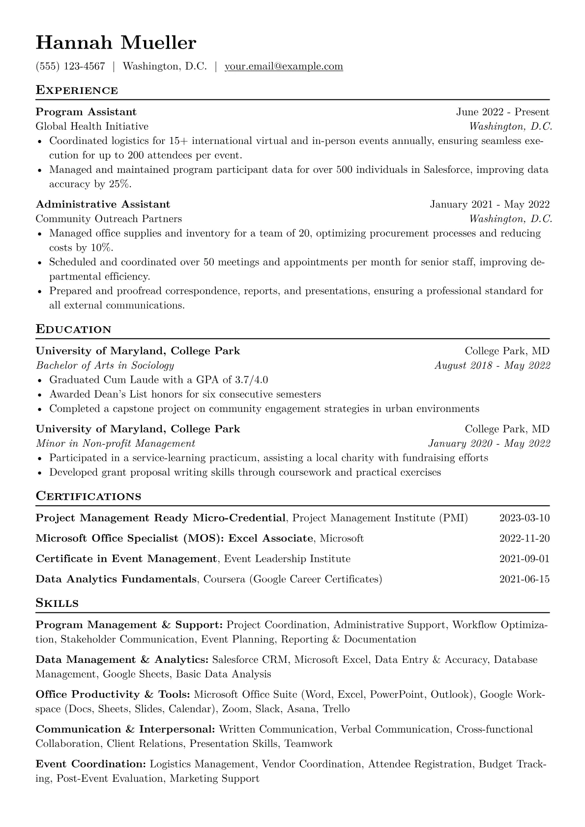 This JobSprout example excels by featuring clear, quantified achievements, even from volunteer or academic experiences, demonstrating tangible impact. Its well-structured skills section groups relevant proficiencies like administrative support, event coordination, and communication, making them easily scannable for recruiters. The inclusion of any relevant certifications or training further strengthens its appeal.