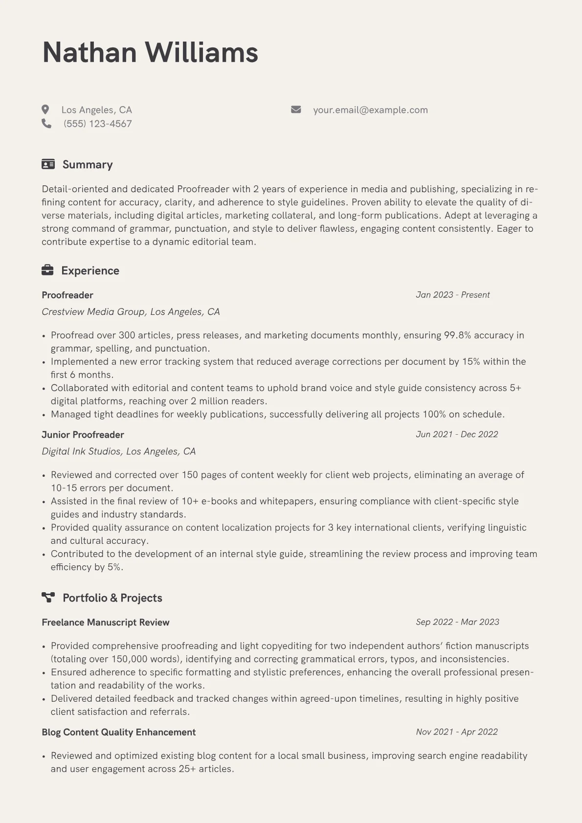 This template was built with JobSprout and can be remixed to create your own tailored Proofreader resume.