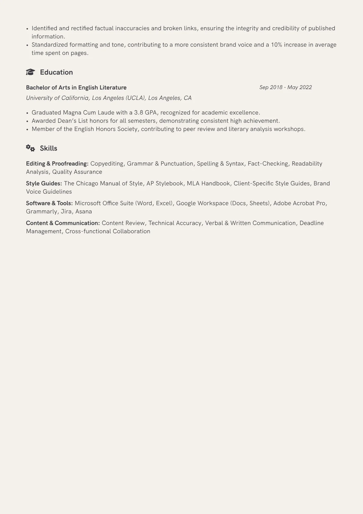 The example CV excels by structuring relevant experience for this specialized role. It effectively quantifies achievements, such as "Reviewed UI text for 5+ mobile applications" or "Ensured linguistic consistency across 3 major product launches." Skills are thoughtfully grouped to showcase proficiency in both editorial tools, like specific style guides (e.g., Chicago Manual of Style, internal brand guides), and relevant design tools for feedback, such as Figma or Adobe XD. This clear delineation immediately communicates a candidate’s practical capabilities.