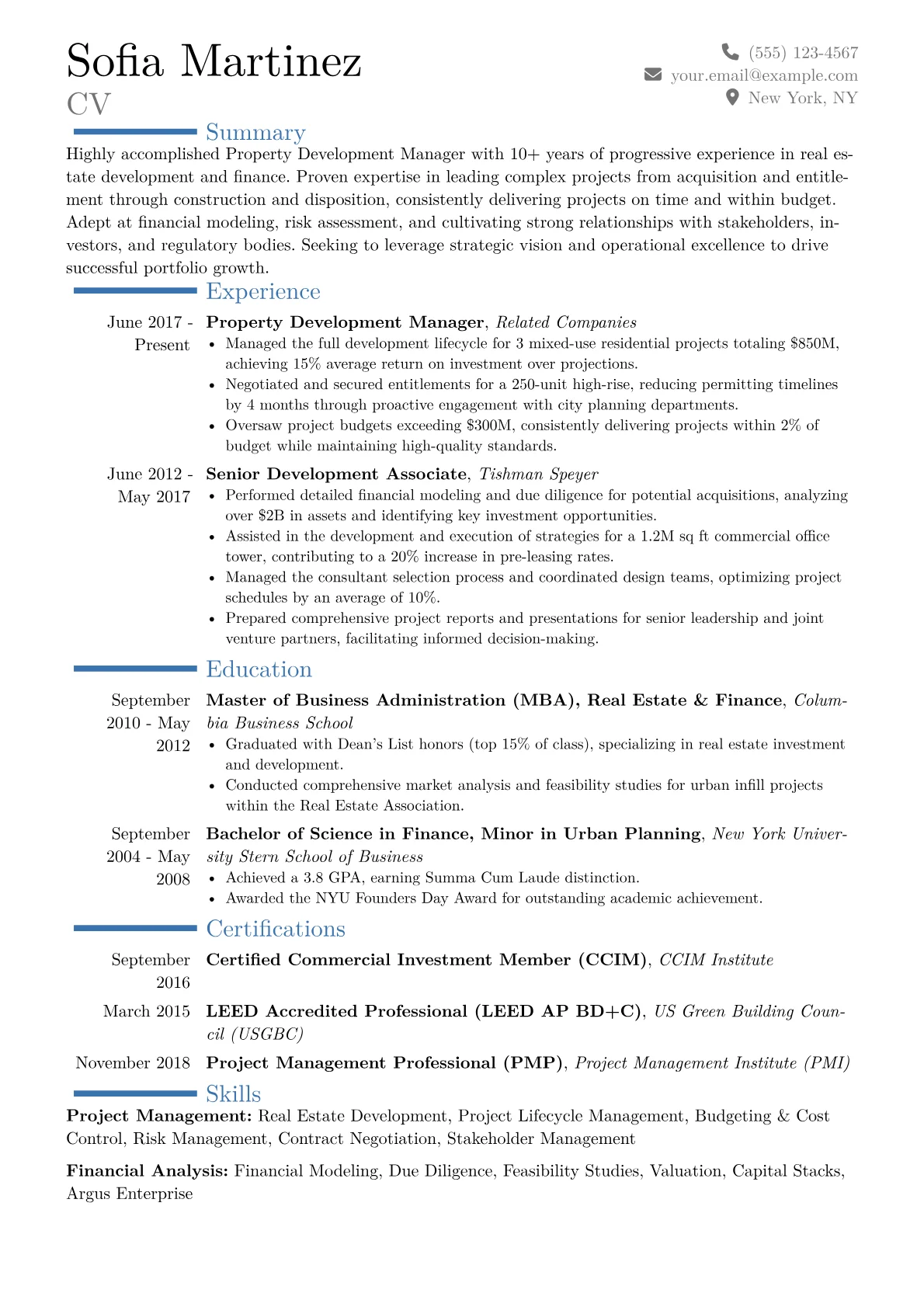 This example resume effectively structures critical information for maximum impact. Achievements are expertly quantified, detailing financial contributions such as managing multi-million dollar project portfolios or achieving specific ROI targets through strategic development. Skills are thoughtfully grouped into categories like 'Financial Analysis & Underwriting,' 'Project Finance & Capital Markets,' and 'Investment Due Diligence,' which resonate with finance professionals. Furthermore, certifications like a CFA designation or relevant real estate licenses, alongside specific software proficiencies such as Argus and advanced Excel modeling, are prominently featured, demonstrating a comprehensive skill set for the role.