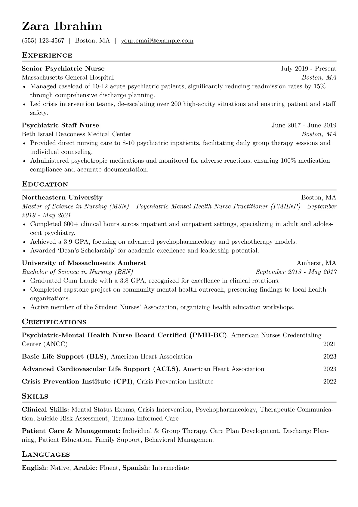 This example resume effectively showcases these critical elements. It quantifies achievements, such as reducing readmission rates by implementing specific patient education programs, providing concrete evidence of impact. Skills are thoughtfully grouped, separating clinical interventions like cognitive behavioral therapy from administrative proficiencies like interdisciplinary team collaboration. Furthermore, certifications like PMH-BC and Crisis Prevention Institute (CPI) training are strategically highlighted, immediately communicating specialized expertise essential for a mid-level Psychiatric Nurse.