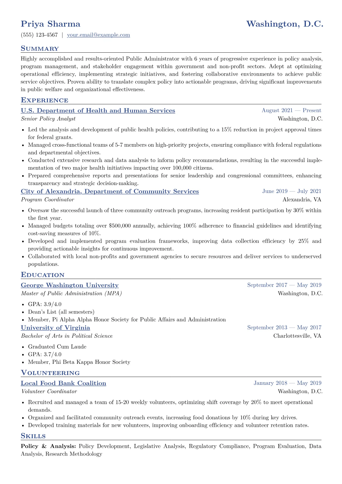 This example CV effectively highlights a Public Administrator's unique value within the public sector. Achievements are consistently quantified, demonstrating tangible impacts like "reduced permit processing time by 18%" or "managed a $2.5 million departmental budget." Skills are thoughtfully grouped into "Policy & Program Management," "Operations & Compliance," and "Technical & Data Tools," clearly separating expertise in legislative analysis from proficiency in systems like SharePoint or specific ERP platforms. Critical certifications and government-specific training are prominently listed, reinforcing specialized knowledge and commitment to public sector best practices.