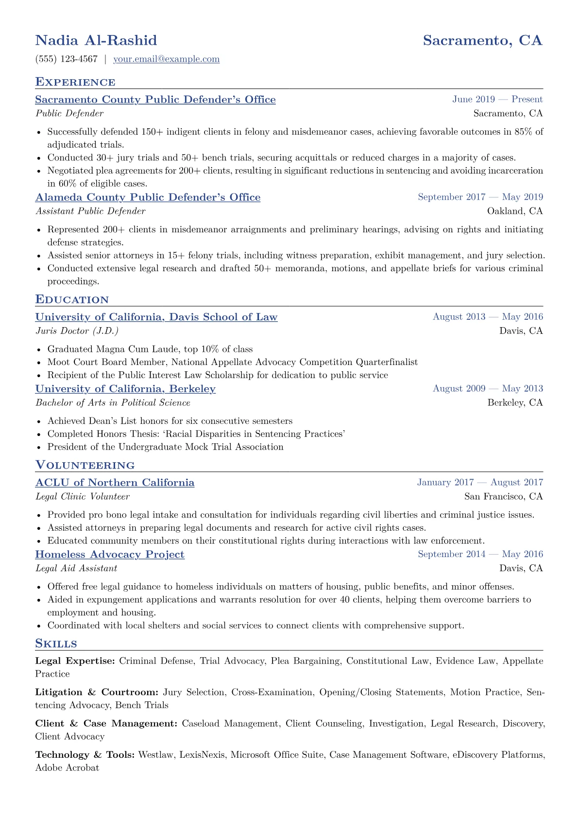 This example excels by clearly articulating quantified achievements, such as specific caseload numbers or successful motion outcomes, which concretely demonstrate impact. Skills are strategically grouped into categories like "Trial Advocacy," "Client Counseling," and "Legal Research," providing an immediate overview of core competencies. The inclusion of relevant legal certifications further reinforces specialized expertise.