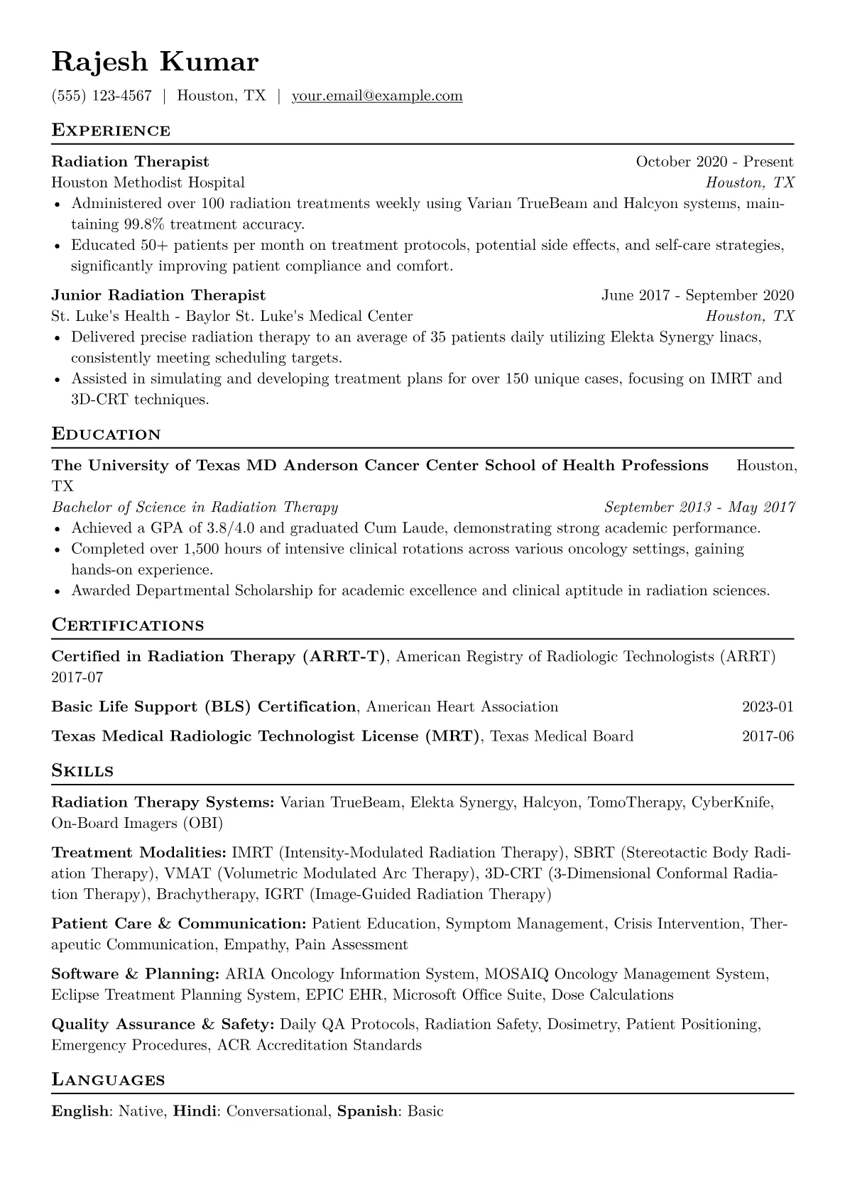 For a Radiation Therapist, a strong resume highlights technical precision, patient empathy, and unwavering commitment to safety. Hiring managers in healthcare prioritize candidates with demonstrable experience in diverse treatment modalities, a meticulous approach to daily tasks, and the critical ability to provide compassionate patient education. The unique challenge lies in showcasing advanced technical proficiency alongside a genuine human touch.