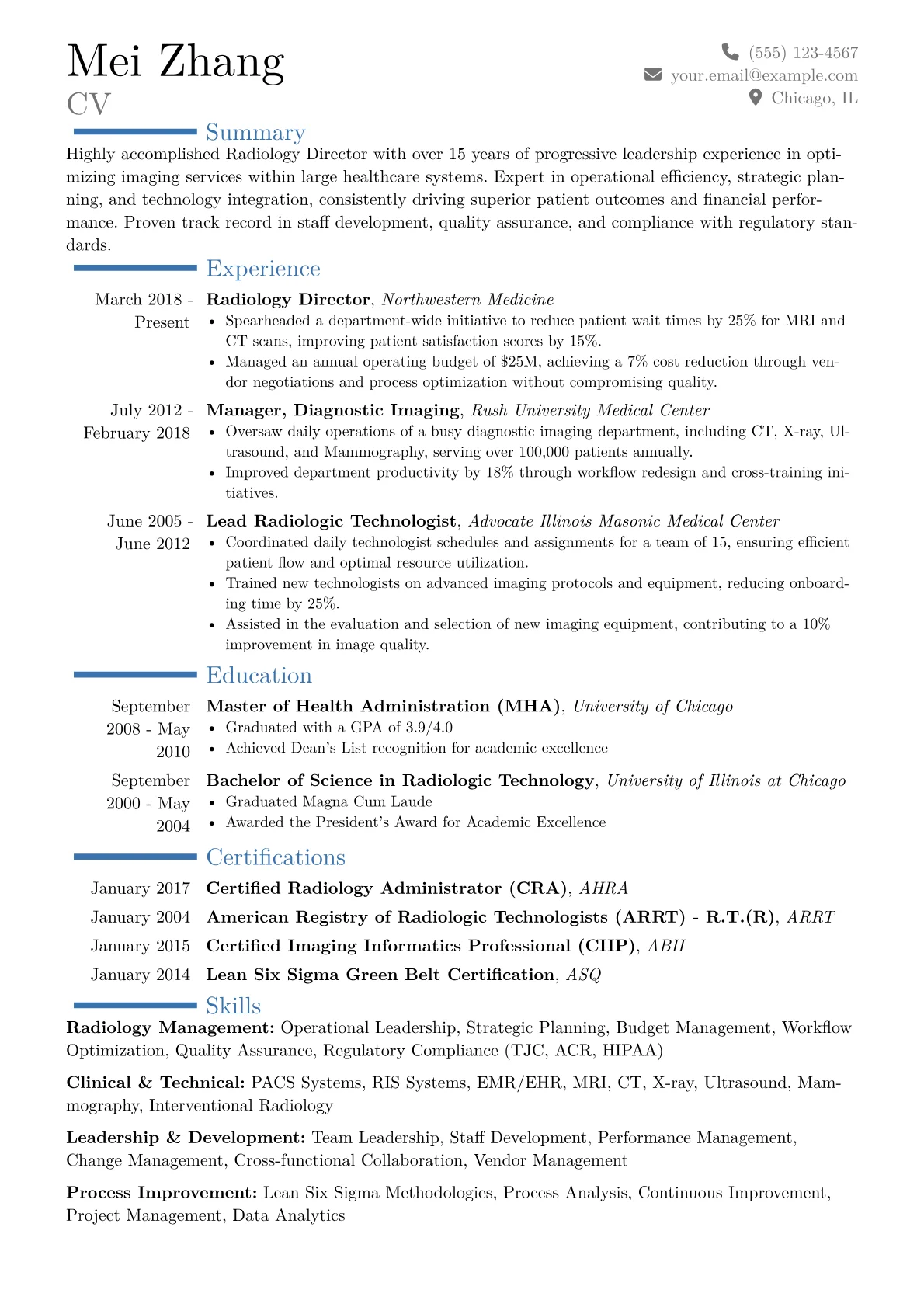 This example CV effectively highlights these critical areas through precise quantification and strategic grouping. Achievements are presented with measurable impact, such as "reduced imaging read times by 15% across five modalities" or "oversaw a $25M departmental budget." Skills are clearly segmented into categories like "Clinical Leadership" and "Operational Management," immediately conveying a comprehensive skillset. Key certifications and proficiency in tools like Philips IntelliSpace PACS or GE Healthcare imaging platforms are prominently featured, assuring employers of technical competence.
