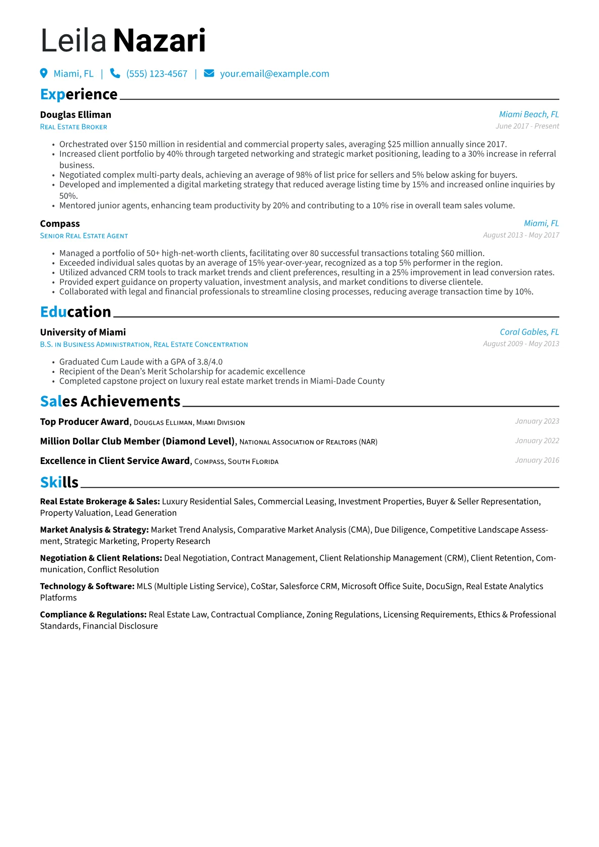 This example excels by prominently featuring quantified achievements, clearly stating how the broker consistently exceeded sales targets and expanded property portfolios. Its effective skills grouping highlights crucial competencies like market analysis, client relationship management, and strategic sales planning, making it easy for recruiters to identify relevant expertise. The inclusion of pertinent certifications further reinforces the candidate's professional credibility and specialized knowledge within the industry.