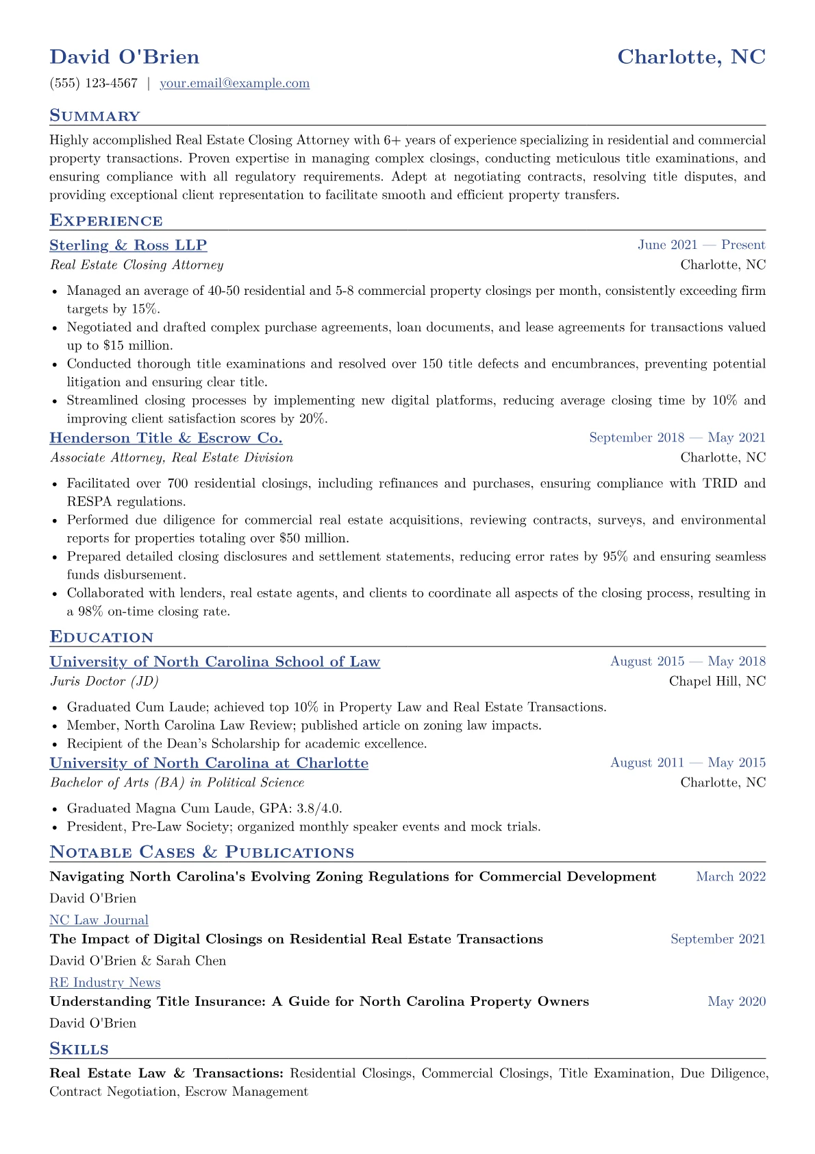 A compelling Real Estate Closing Attorney resume highlights precision in transactional law and efficient client service. Hiring managers specifically seek candidates adept at navigating complex title examinations, lien clearances, and purchase agreement negotiations, often requiring deep familiarity with ALTA policies and state-specific real estate statutes. Concrete achievements should include successfully resolved title defects, managed portfolios of residential or commercial closings, and streamlined escrow processes, all while maintaining rigorous due diligence and adherence to regulatory compliance. Legal terminology like "deed preparation," "TRID compliance," and "zoning review" are crucial indicators of expertise.