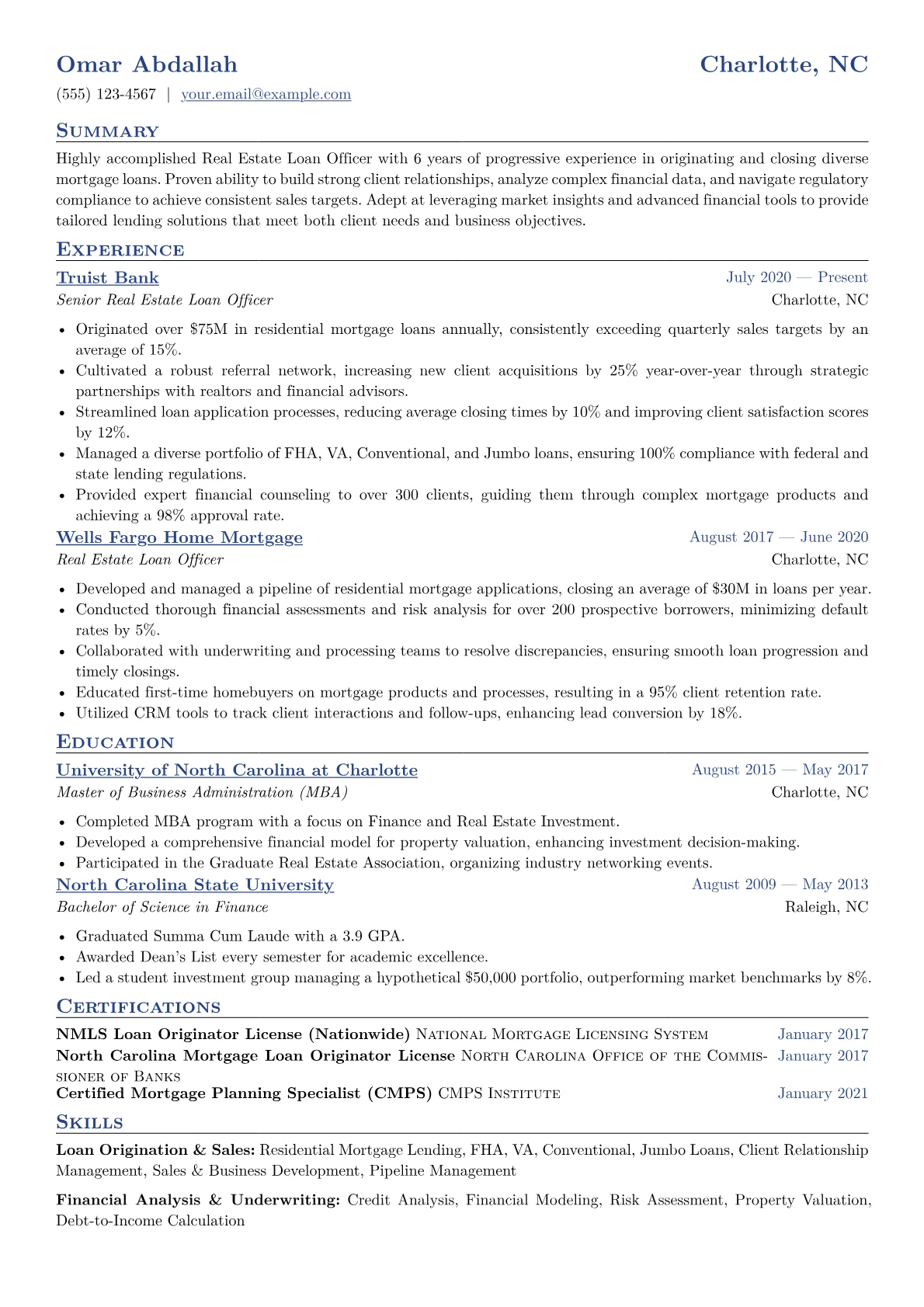 This example CV effectively emphasizes the candidate's impact by quantifying achievements directly, such as "originated $X million in residential loans annually" and "maintained a Y% loan pull-through rate." Skills are thoughtfully grouped into categories like "Loan Origination & Sales," "Underwriting & Compliance," and "Client Relationship Management," which provides clarity on diverse capabilities. Furthermore, the resume prominently displays the candidate's NMLS ID and lists relevant industry software, assuring hiring managers of immediate operational readiness.