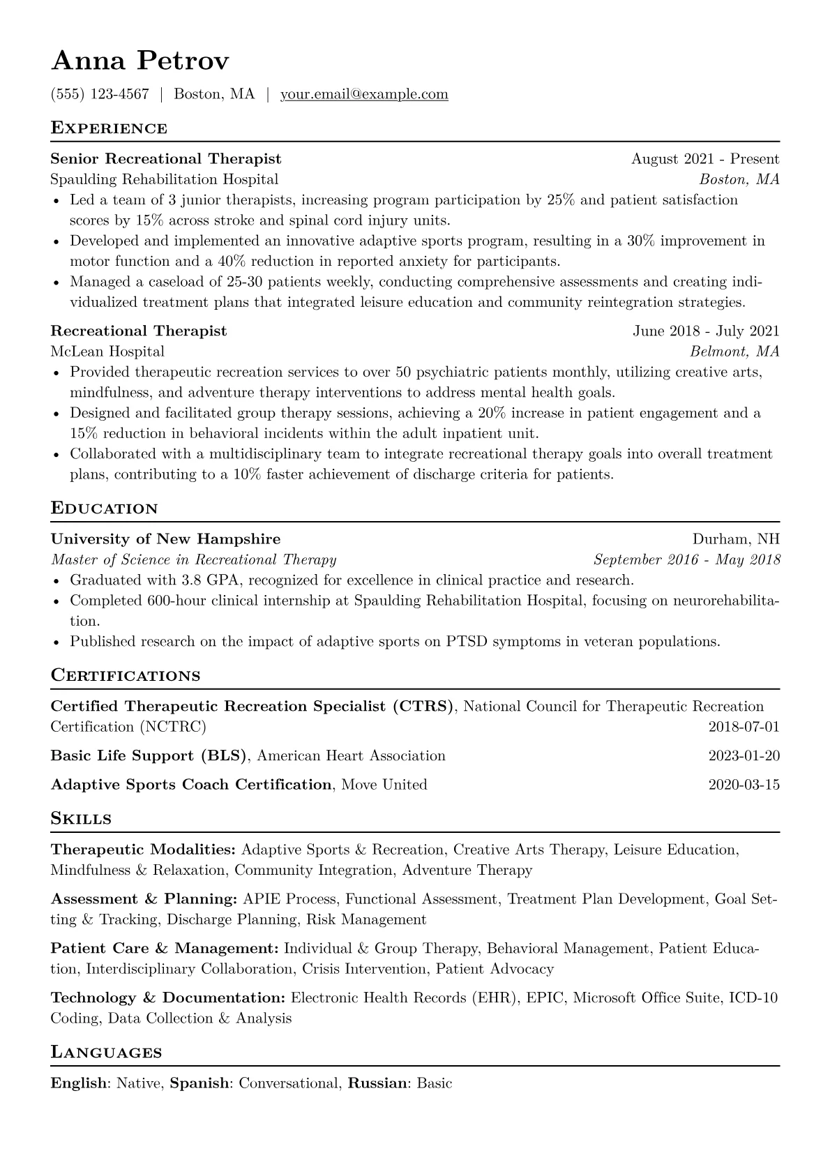A strong Recreational Therapist resume emphasizes a candidate's ability to design and implement therapeutic programs that improve patient well-being and functional abilities. Healthcare recruiters look for evidence of clinical expertise, interdisciplinary collaboration, and a deep understanding of diverse patient needs, often across various conditions and age groups. A key challenge is showcasing the tangible impact of recreational interventions on recovery and quality of life.
