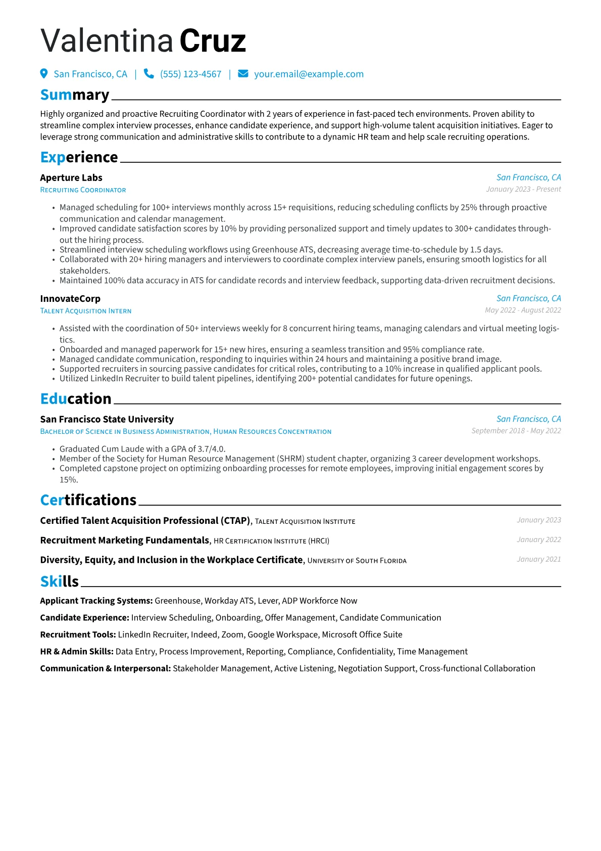 A strong entry-level Recruiting Coordinator resume emphasizes meticulous organization, clear communication, and technical proficiency. Hiring managers in Human Resources seek candidates who can efficiently manage complex interview logistics, maintain active candidate pipelines, and significantly contribute to a positive candidate experience. Key achievements should highlight precision in scheduling, managing high volumes of candidate correspondence, and supporting interview processes for multiple stakeholders. Familiarity with Applicant Tracking Systems (ATS) like Greenhouse or Workday, calendar management tools, and HR compliance basics (EEO) are highly valued. Showcasing experience in drafting offer letters or coordinating onboarding tasks also demonstrates readiness.