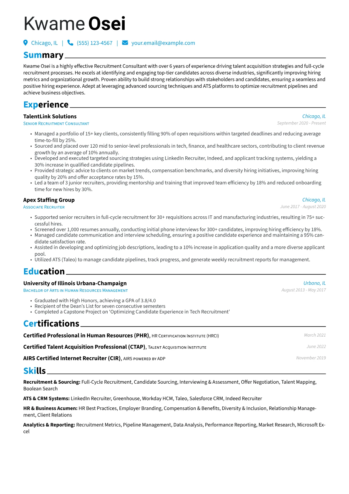 This example CV effectively highlights a Recruitment Consultant's core competencies by segmenting skills into client management, candidate sourcing, and operational efficiency. Achievements are well quantified, detailing successful placement volumes and associated revenue impact rather than simply listing duties. The resume clearly lists relevant tools like Bullhorn ATS and LinkedIn Recruiter, along with any professional development, ensuring hiring managers quickly grasp the candidate's technical capabilities and strategic thinking. This targeted approach prioritizes measurable outcomes critical for a dynamic recruitment role.