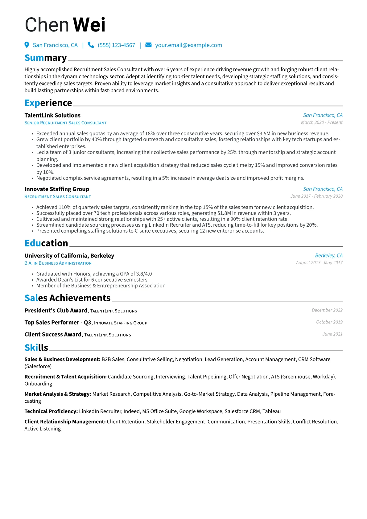 This JobSprout example effectively demonstrates these critical elements. Achievements are precisely quantified, detailing revenue growth, successful placements of senior engineers, and expansion of client portfolios. Technical and sales skills are strategically grouped, showcasing expertise in areas like "SaaS Recruitment" and "Business Development" alongside "Candidate Experience Management." The resume clearly highlights proficiency in industry-standard tools and methodologies, such as particular programming languages relevant to sourced roles or experience with specific recruitment software, making the candidate’s capabilities immediately apparent to a tech recruiter.