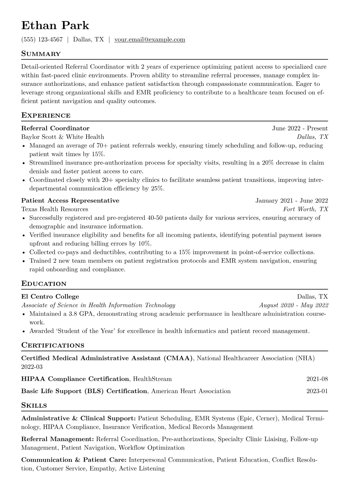 A compelling entry-level Referral Coordinator resume in Healthcare showcases acute attention to detail and patient-centric communication. Hiring managers specifically seek candidates adept at navigating complex insurance pre-authorizations and scheduling systems, understanding the critical link between referral accuracy and patient care continuity. Key achievements to highlight include contributions to reducing patient wait times or improving appointment adherence rates. Crucial terminology like HIPAA compliance, EMR/EHR proficiency (e.g., Epic, Cerner), and knowledge of medical coding (ICD-10, CPT) demonstrates readiness for the role's demanding environment. Certifications in medical office administration or similar fields further solidify a candidate's foundational expertise.