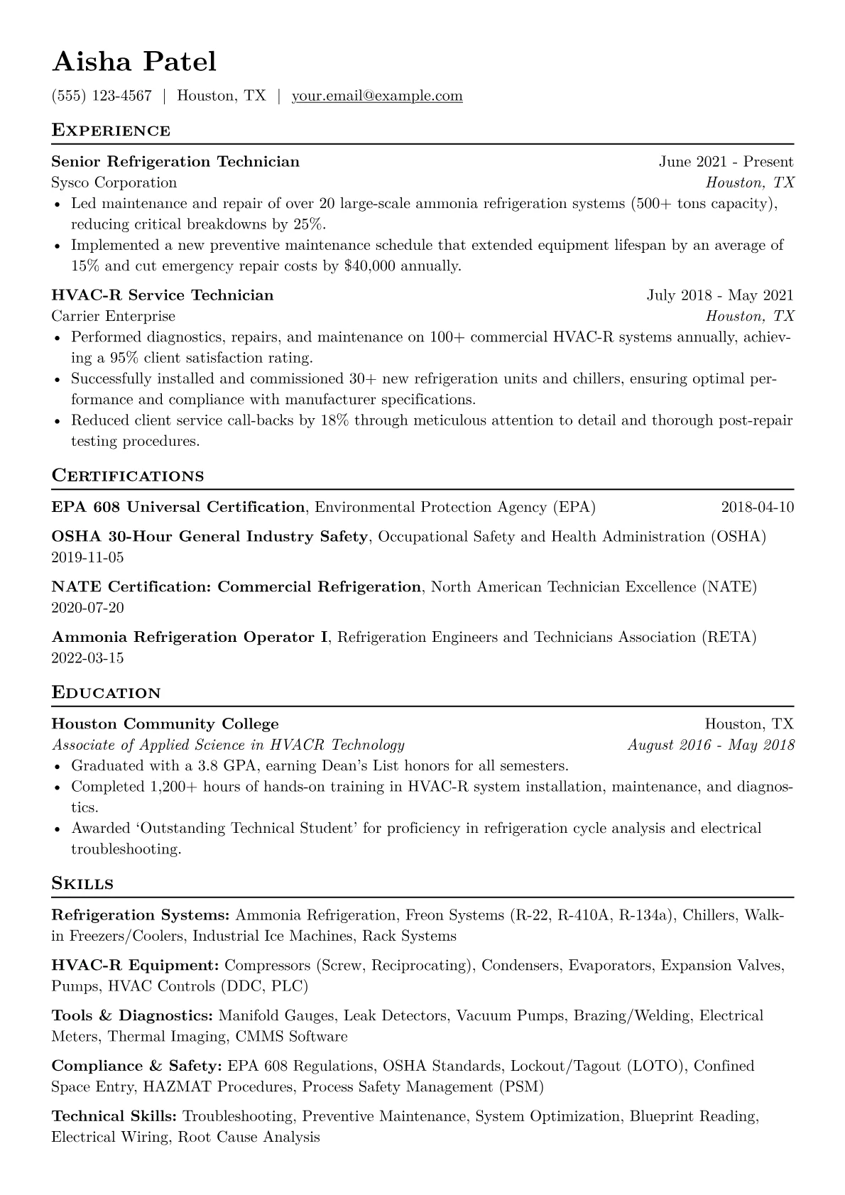 This JobSprout example excels by showcasing quantified achievements, such as reducing system failures by a specific percentage or improving energy efficiency. It effectively groups relevant certifications like EPA 608 and OSHA, demonstrating compliance and specialized knowledge. The clear skills section further emphasizes expertise in areas like preventative maintenance, troubleshooting, and specific refrigerant types essential for industrial settings.