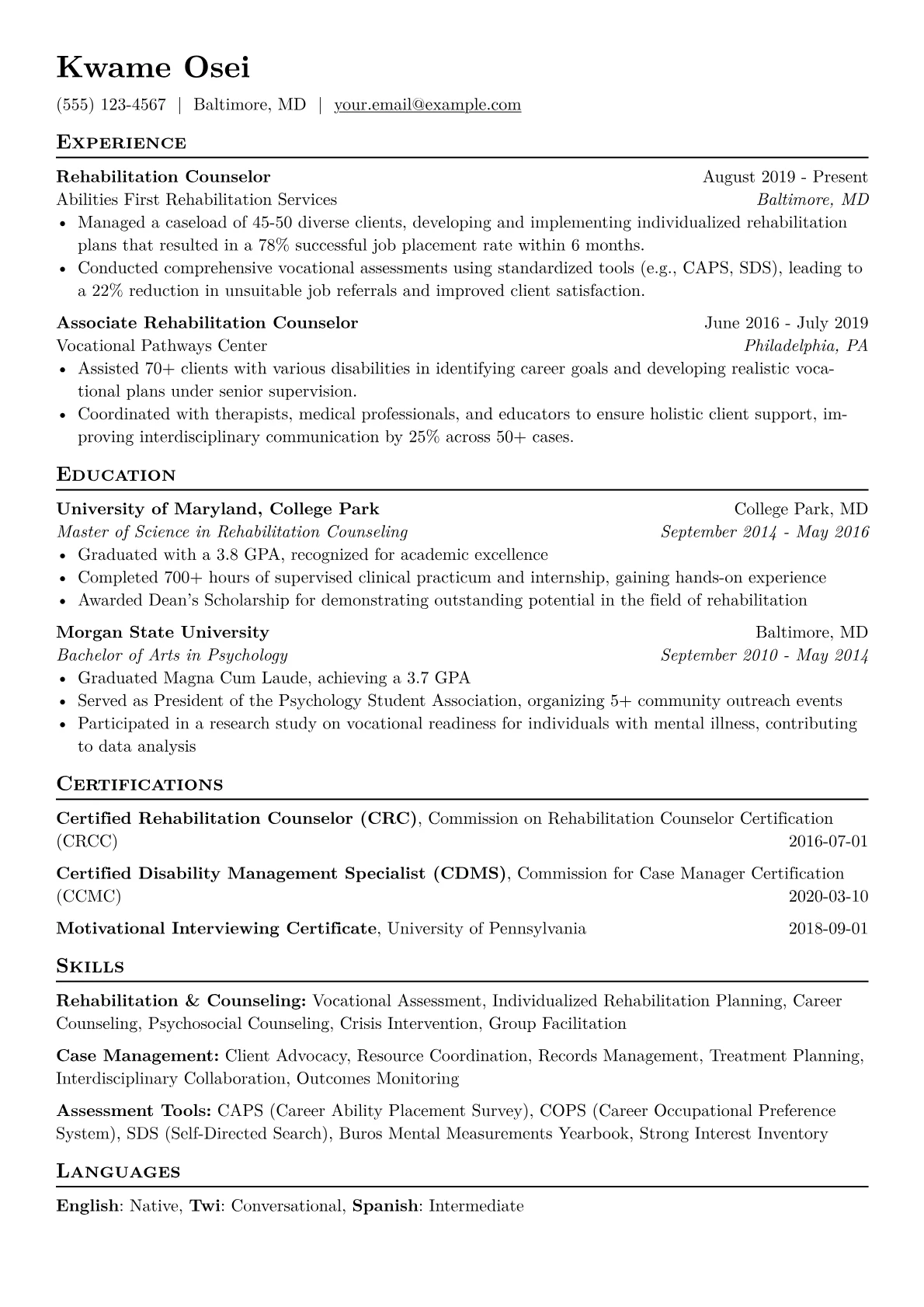 This template, built with JobSprout, offers a professional and clear framework that can be easily remixed to create your own compelling Rehabilitation Counselor resume.