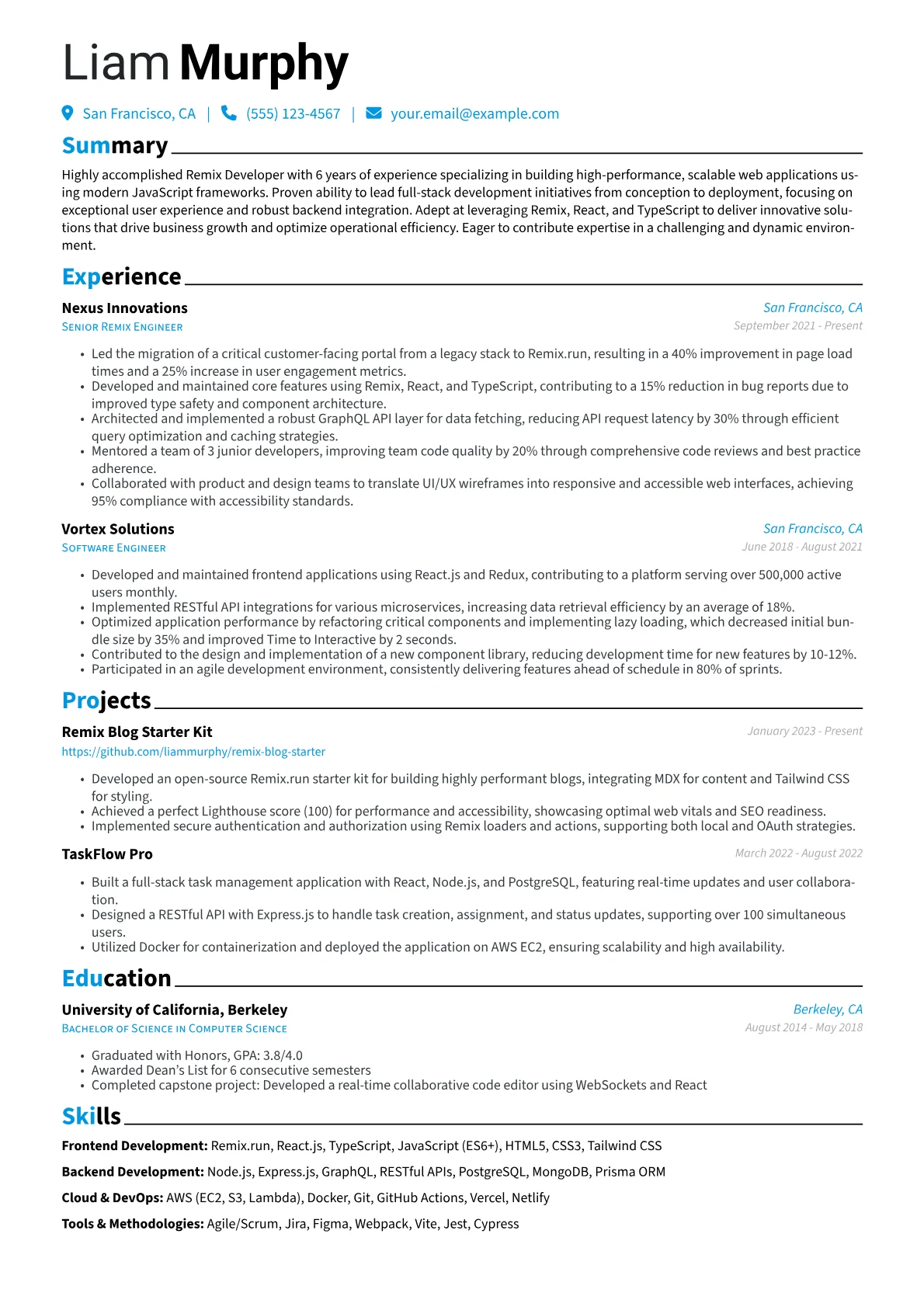 This example CV excels by structuring its content to immediately highlight relevant Remix experience. Achievements are quantified, for instance, by detailing "reduced initial page load times by 25% through Remix data revalidation strategies." Skills are clearly grouped into categories such as 'Frameworks (Remix, React)', 'Languages (TypeScript, JavaScript)', and 'Deployment (Vercel, AWS Amplify)', ensuring quick scanning by recruiters. It also effectively showcases specialized tools and methodologies, including utilizing Storybook for component libraries and integrating testing frameworks specific to Remix applications.