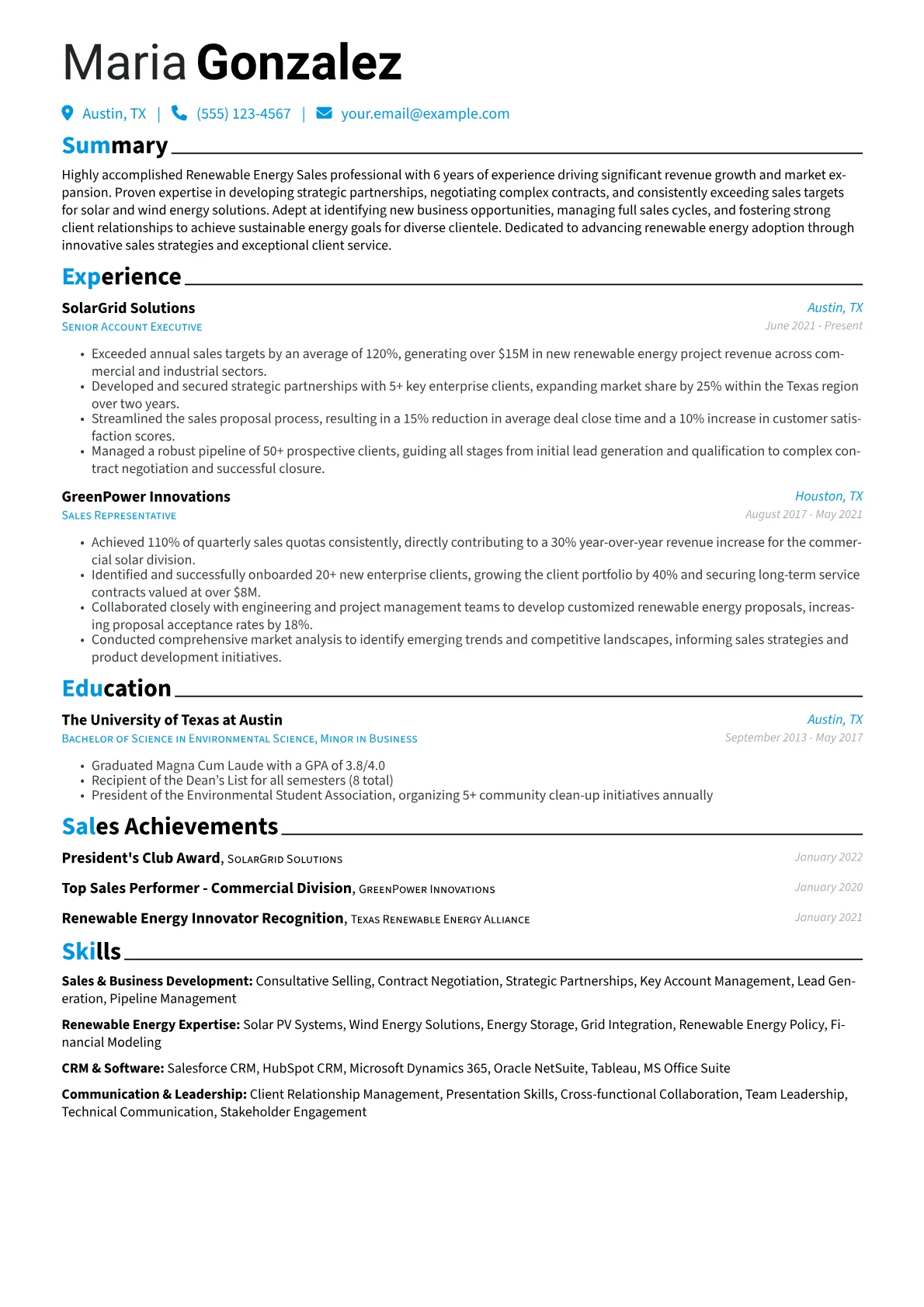 This template was built with JobSprout and can be remixed to create your own tailored Renewable Energy Sales resume. Utilize its structure to highlight your specific expertise and accomplishments effectively.