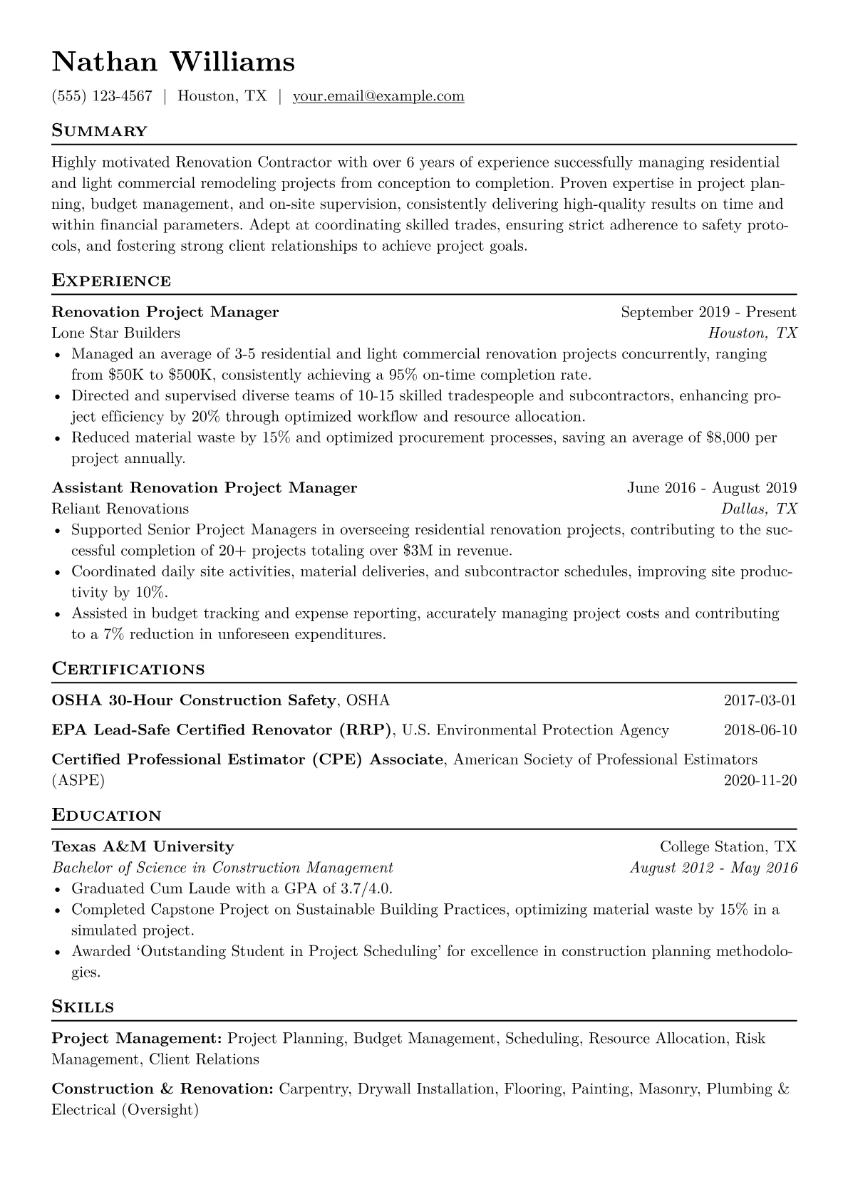 This versatile template was built using JobSprout and can be easily customized to craft your own compelling Renovation Contractor resume.