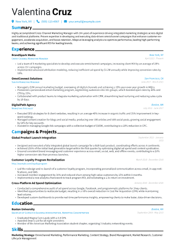 This example CV excels by structuring achievements with clear, data-driven results, such as "improved average online review ratings by 0.7 stars across 15 platforms" or "reduced negative media mentions by 25% during a product recall." The skills section is strategically grouped, featuring dedicated subsections for "ORM Platforms" like Brandwatch and Sprinklr, "Analytics & Reporting" tools, and "Crisis Communication" proficiencies. Key certifications in digital marketing further reinforce the candidate’s specialized expertise.