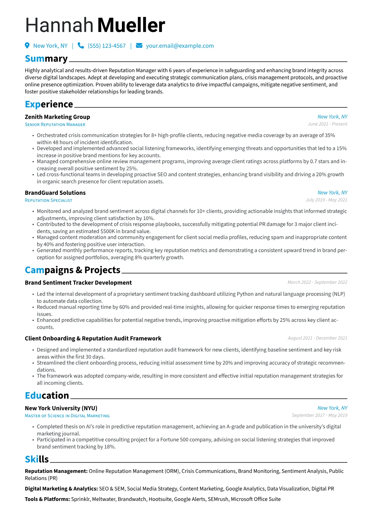 For a mid-level Reputation Manager in Marketing & Advertising, hiring managers specifically seek tangible impacts on brand perception, not just activity. A strong resume highlights concrete achievements in improving brand sentiment scores, successfully navigating online crises, and proactively shaping brand narrative across digital channels. Recruiters look for experience with sentiment analysis tools, SEO for reputation management, and demonstrated success in converting negative feedback into positive brand interactions, often through detailed project examples and quantifiable outcomes.