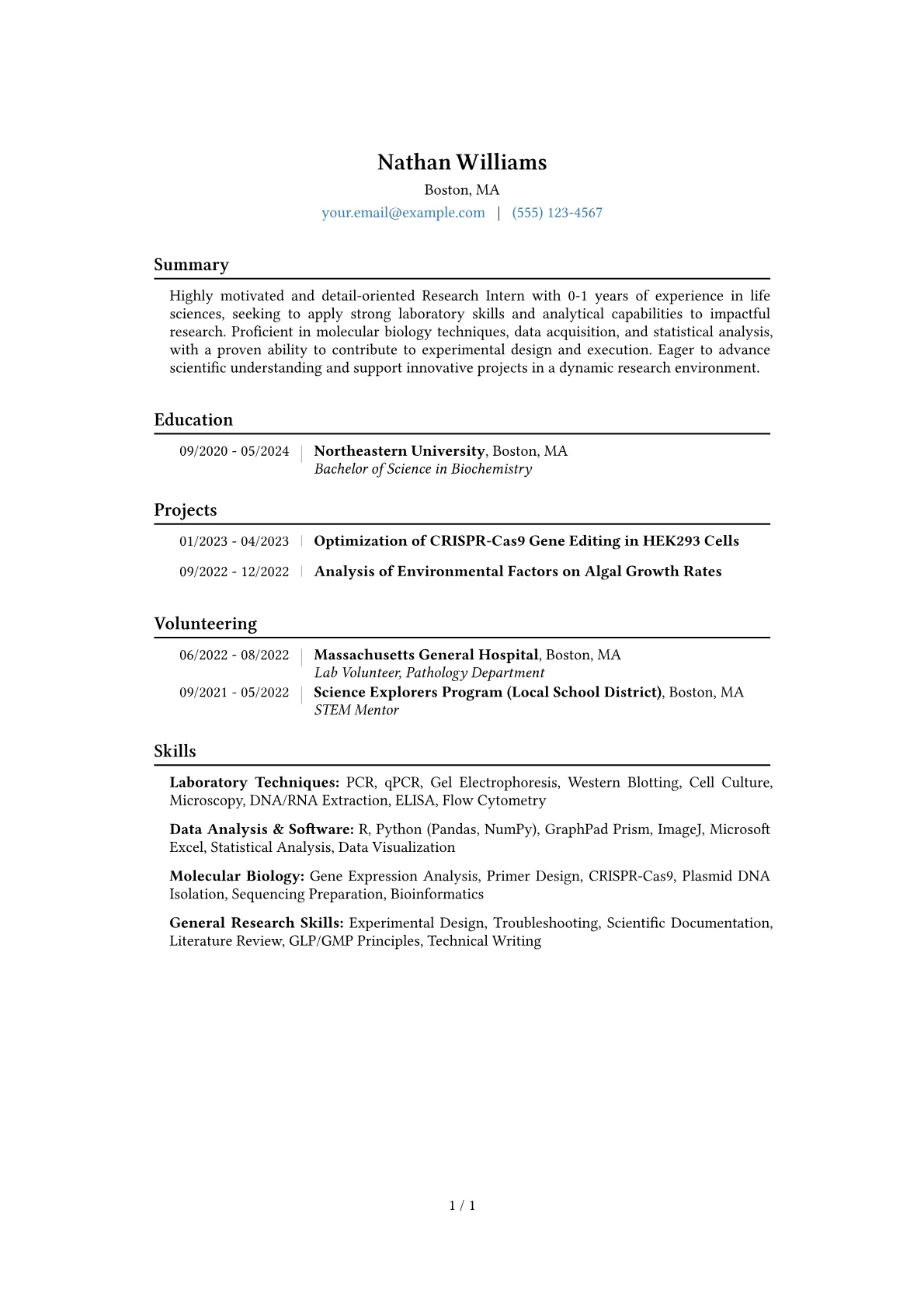 This template was built with JobSprout and can be remixed to create your own tailored Research Intern Life Sciences resume. Leverage its structure to showcase your unique contributions and technical expertise effectively.