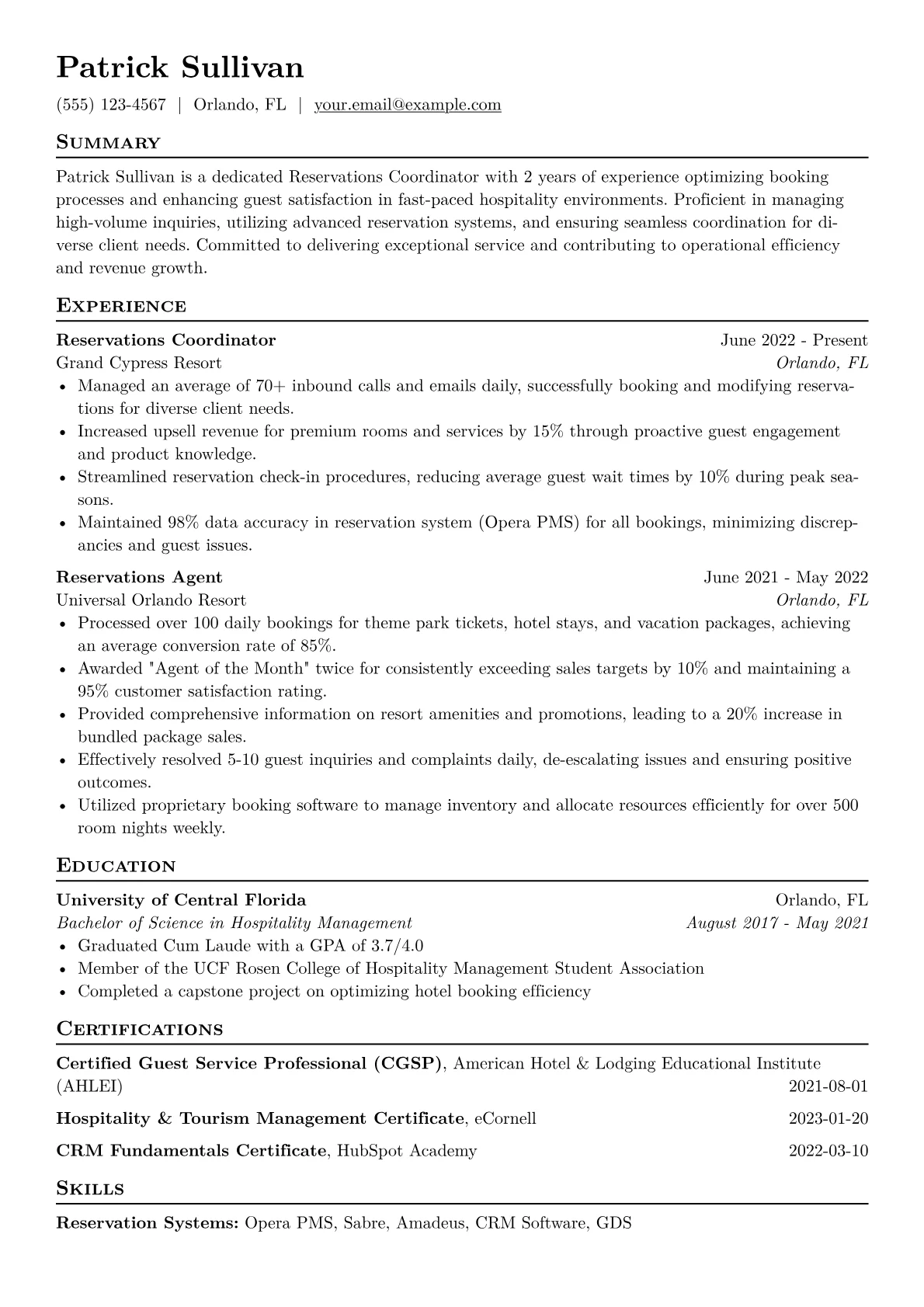 This template was built with JobSprout and can be remixed to create your own tailored Reservations Coordinator resume.