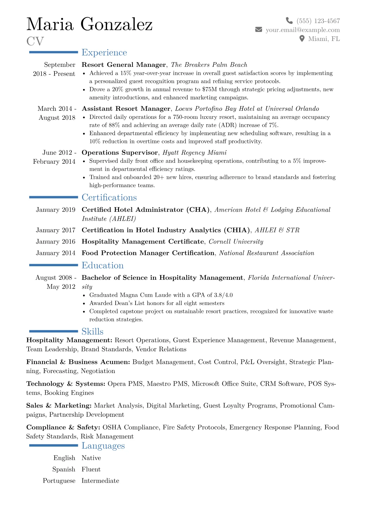 This resume example excels by featuring clearly quantified achievements throughout, illustrating tangible impacts on revenue, efficiency, and guest satisfaction metrics. Its well-organized skills grouping immediately conveys a comprehensive operational expertise, covering areas from staff management to budget oversight. Furthermore, the inclusion of relevant certifications reinforces a commitment to professional development and industry best practices.