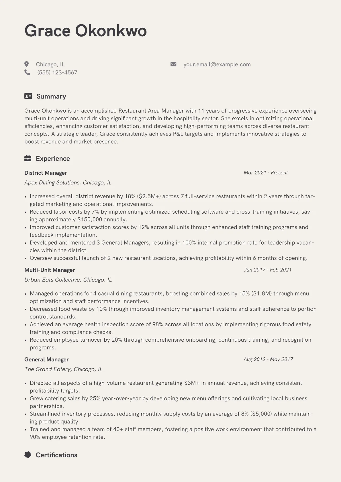 This template was built with JobSprout and can be remixed to create your own tailored Restaurant Area Manager resume. It provides a robust framework to showcase your specific achievements and senior-level capabilities.
